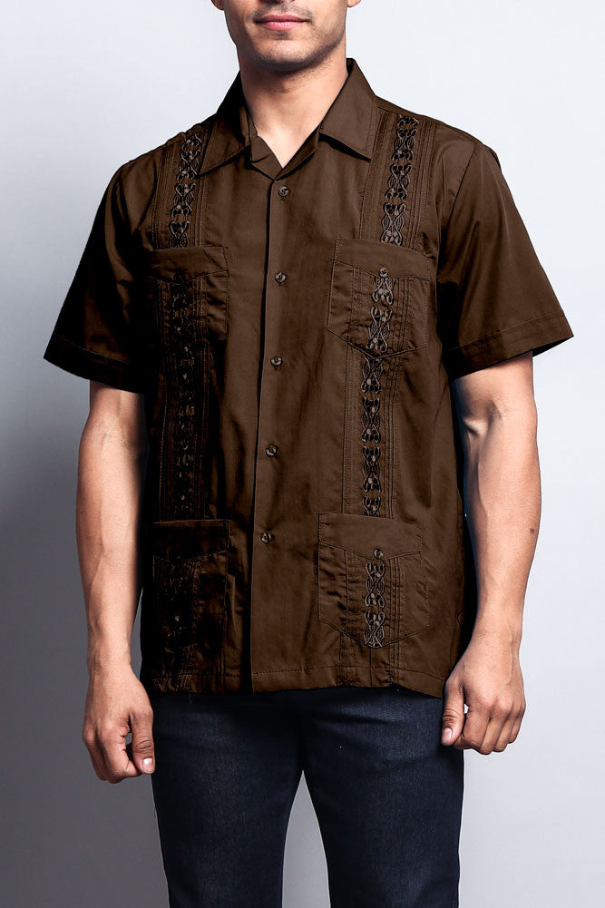 Upgrade your warm-weather wardrobe with this Cuban style guayabera shirt detailed with embroidery going down both sides.