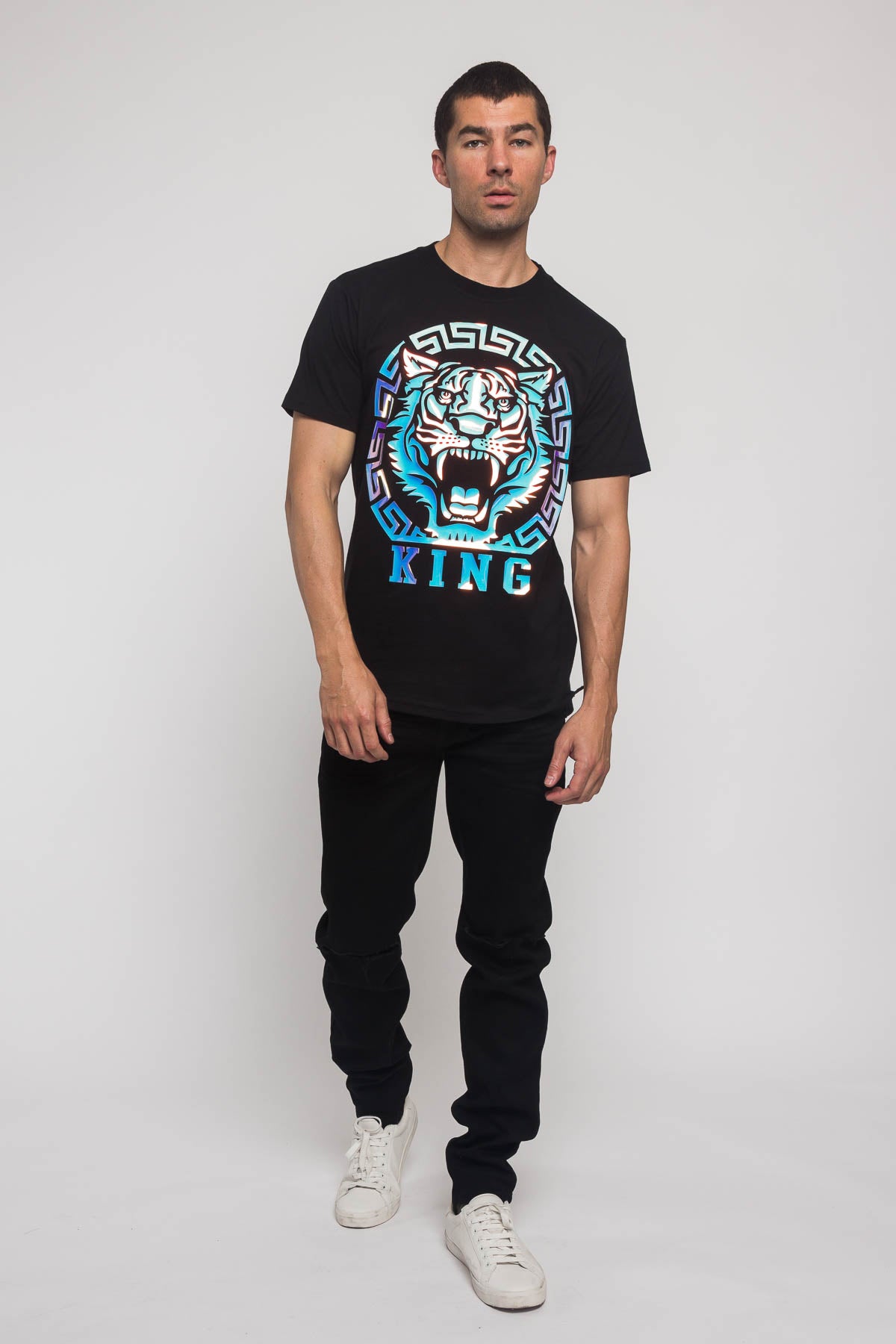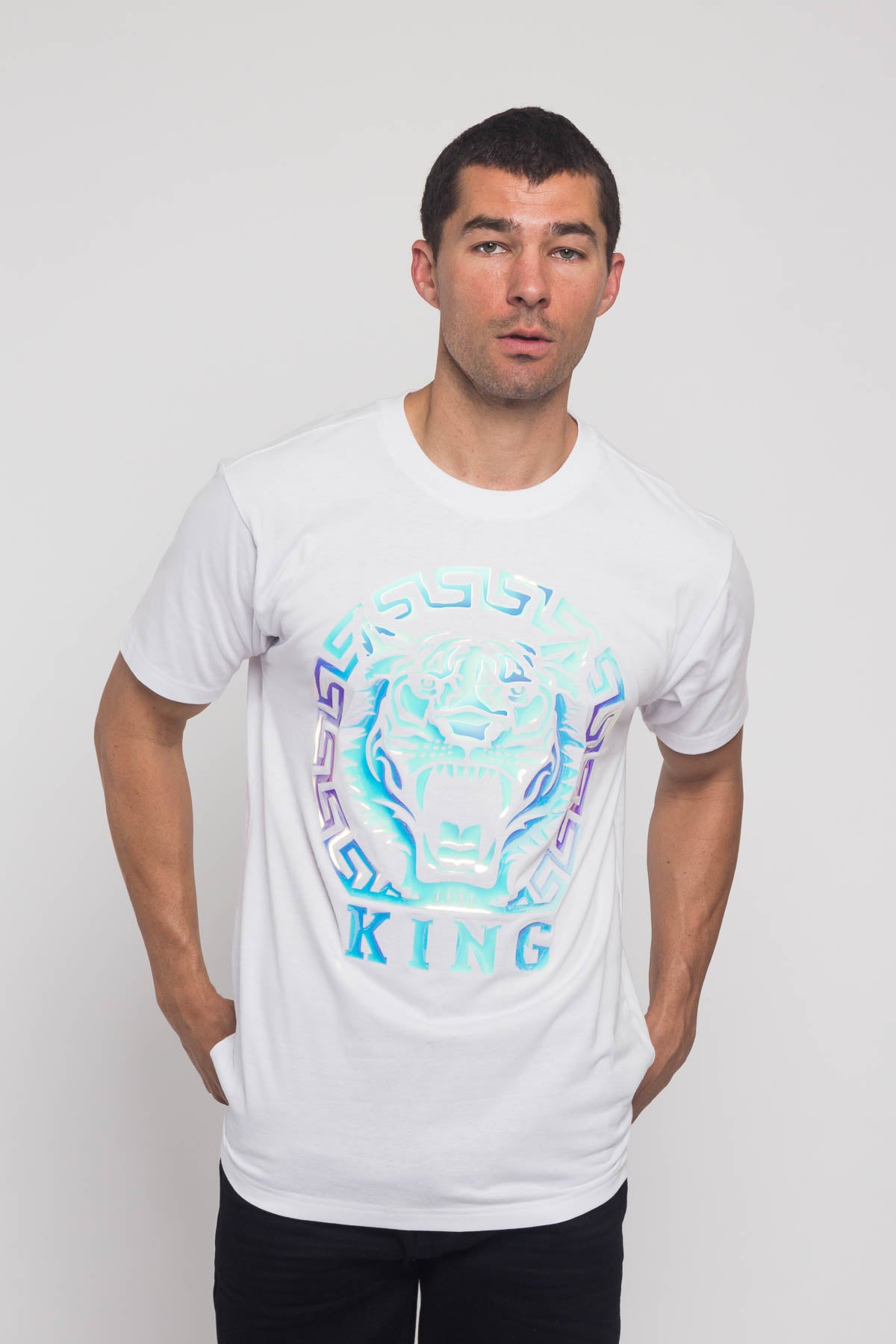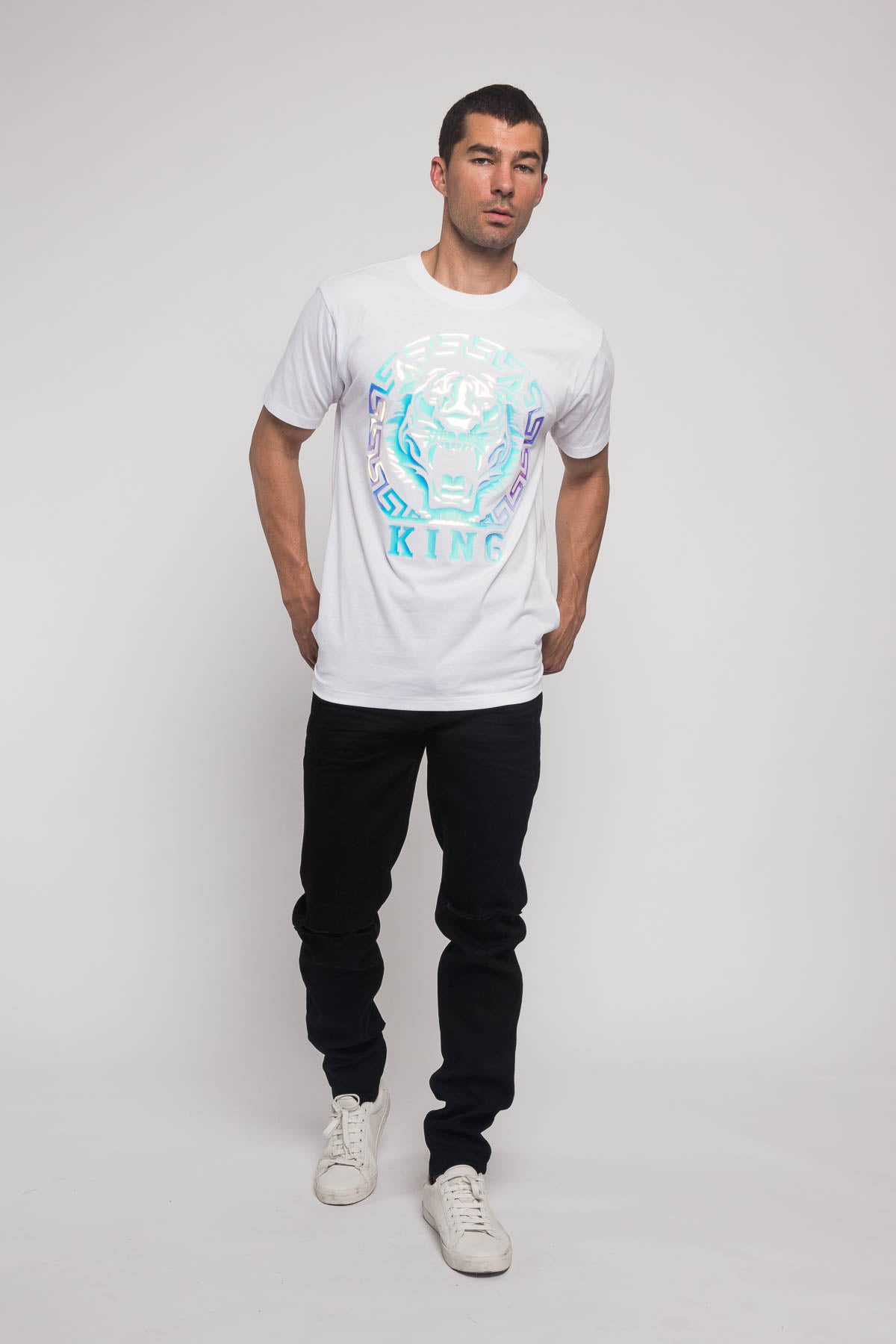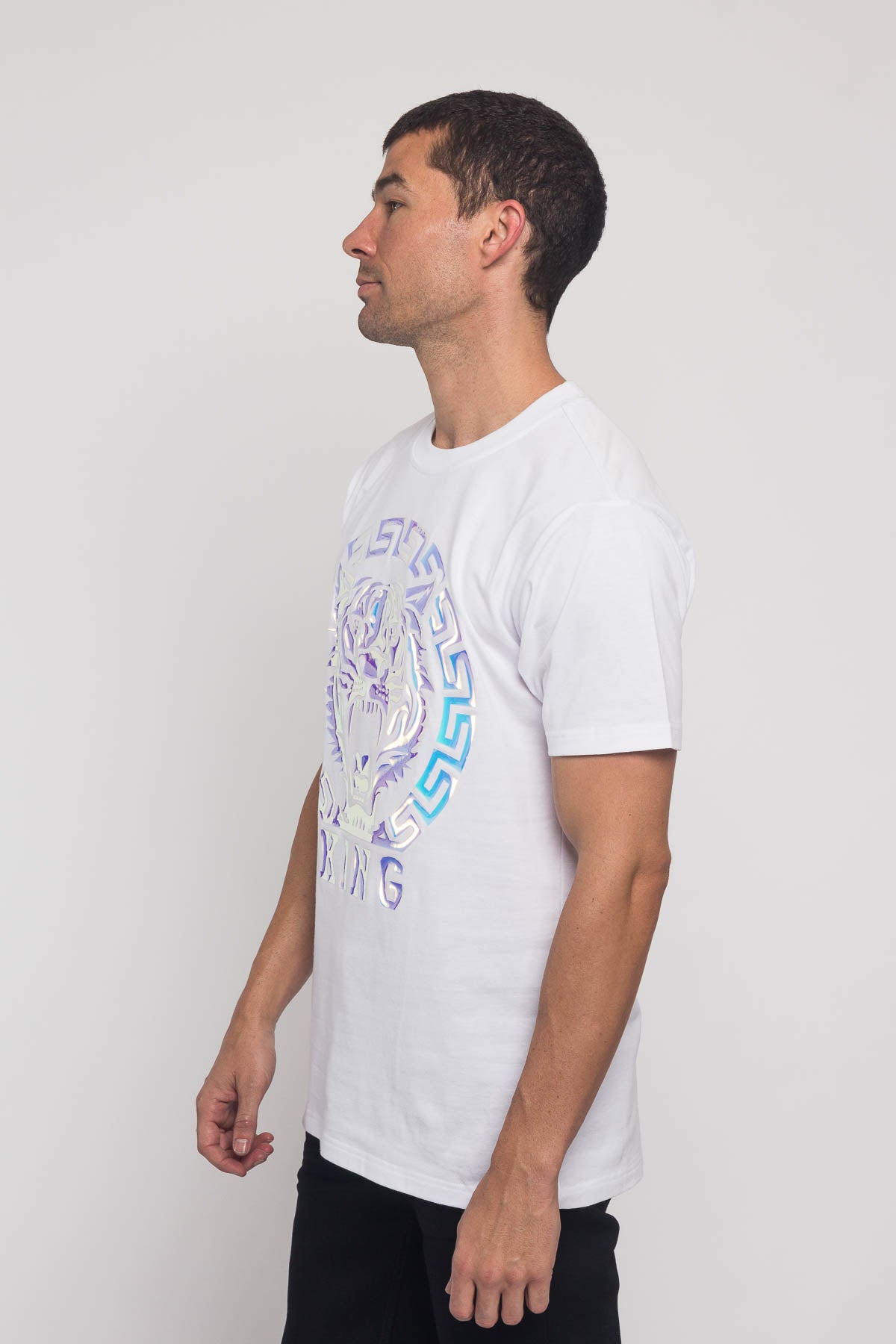 Pop out and stand out wherever you go in our trendy new tee. Our super stylish shirt is the perfect remix of a classic tee. This tee features detailed iridescent foil to catch attention while complimenting the latest high fashion trends.