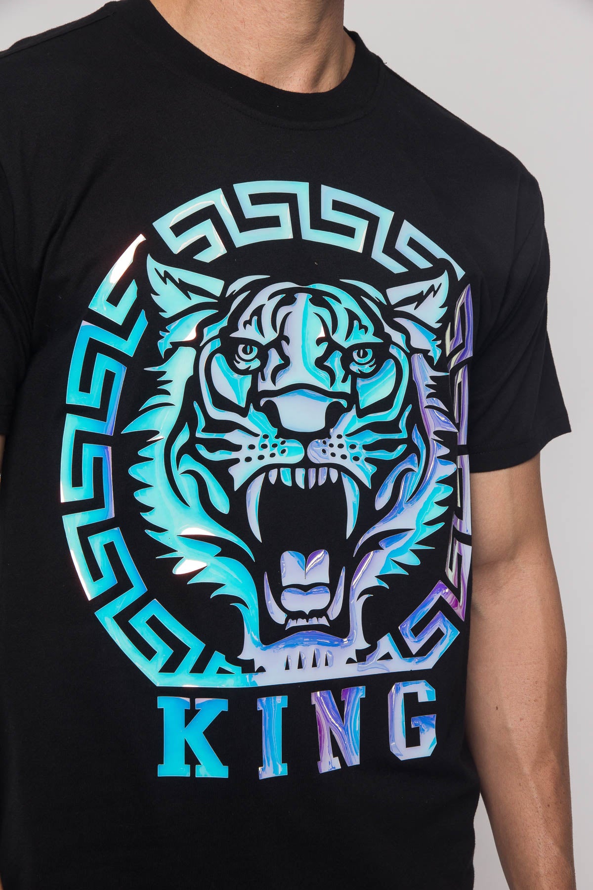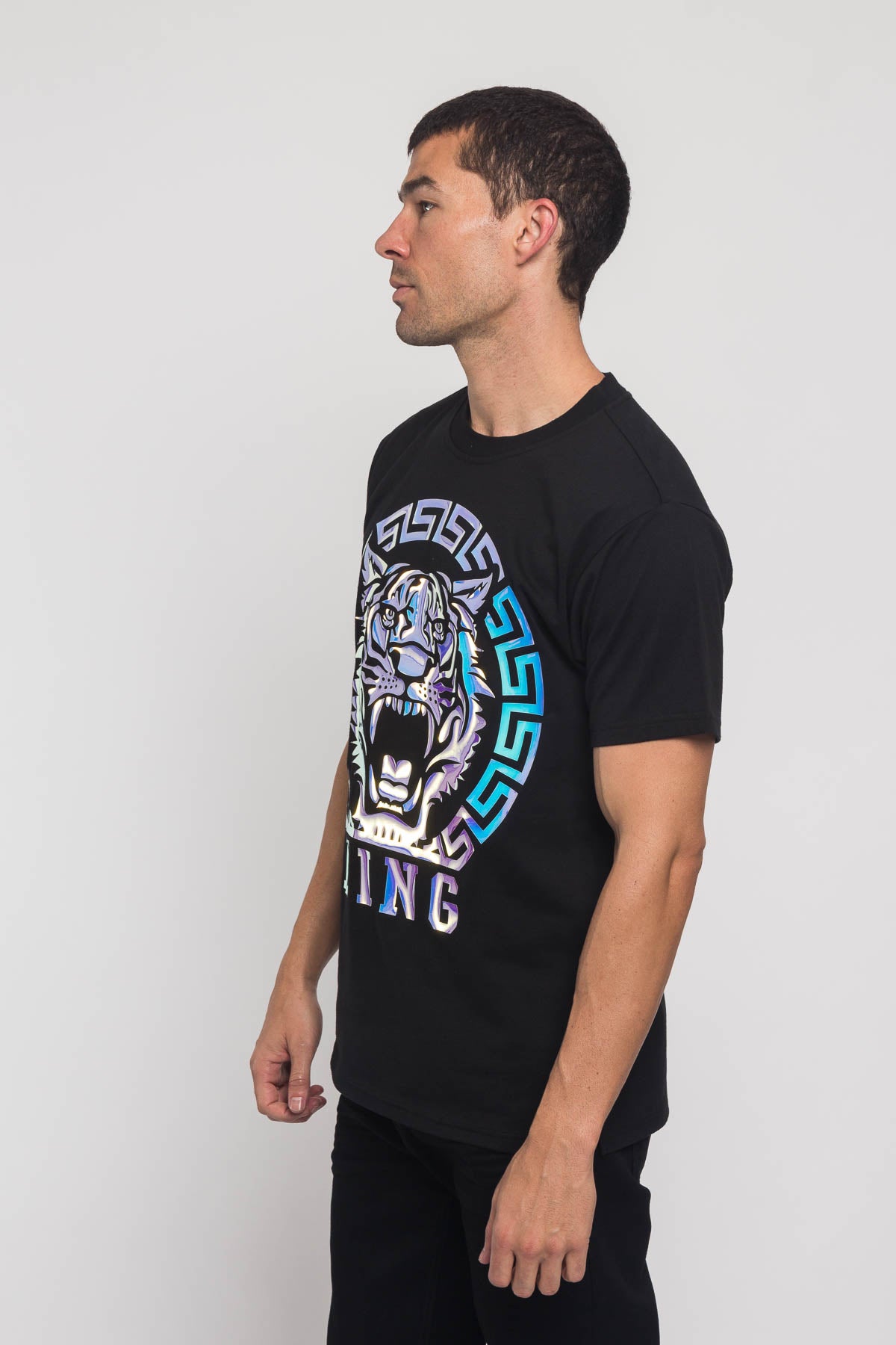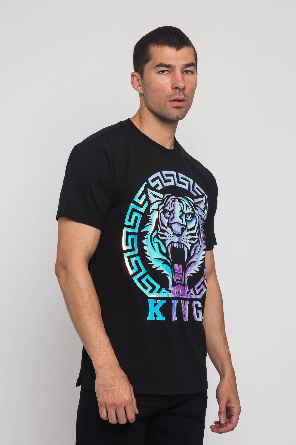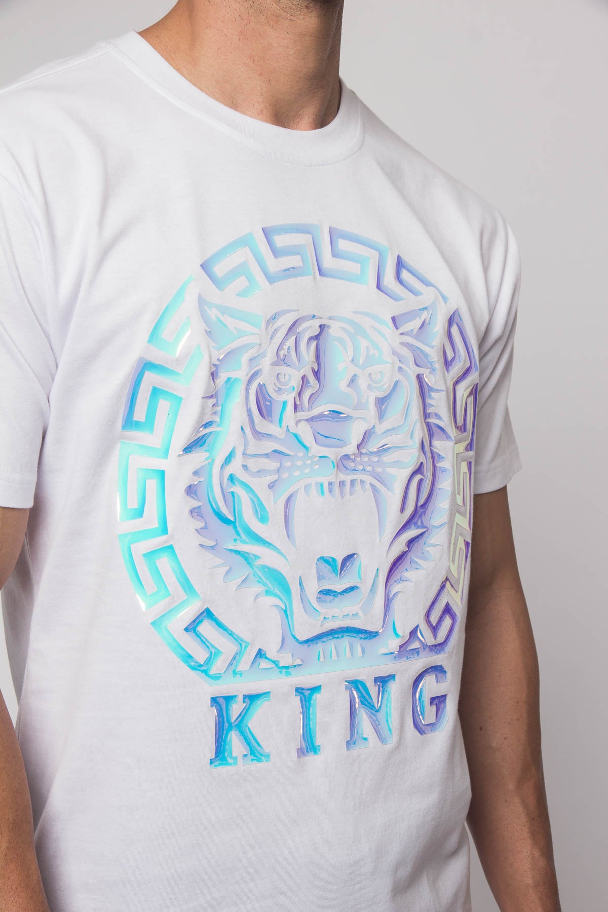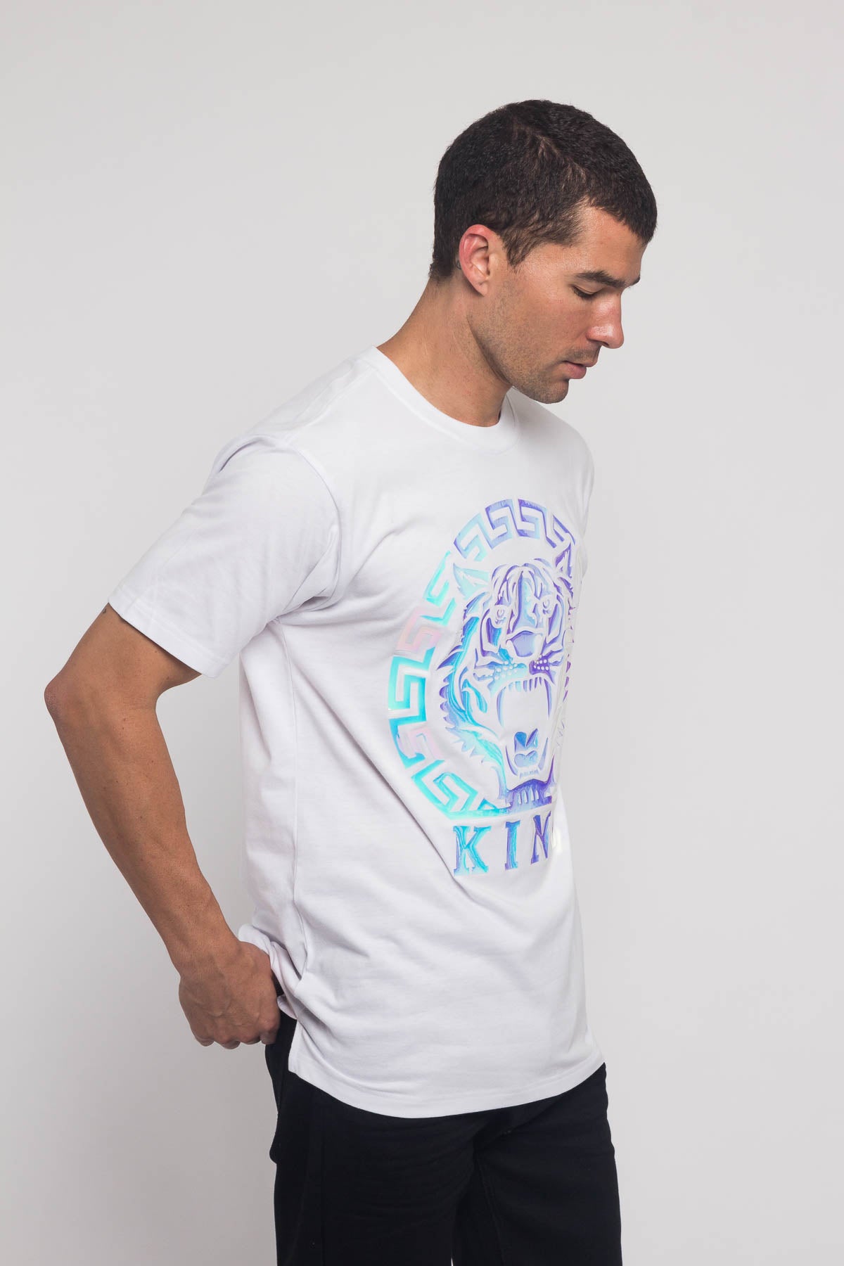 Pop out and stand out wherever you go in our trendy new tee. Our super stylish shirt is the perfect remix of a classic tee. This tee features detailed iridescent foil to catch attention while complimenting the latest high fashion trends.