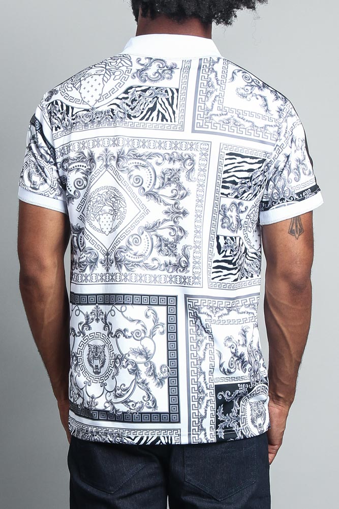 Look fly in our new luxury styled tiger polo. Perfect for looking stylish without the costly prices. Featuring golden metallic foiled bands down the shoulders and golden buttons to compliment the intricate background inspired by famous name brands.