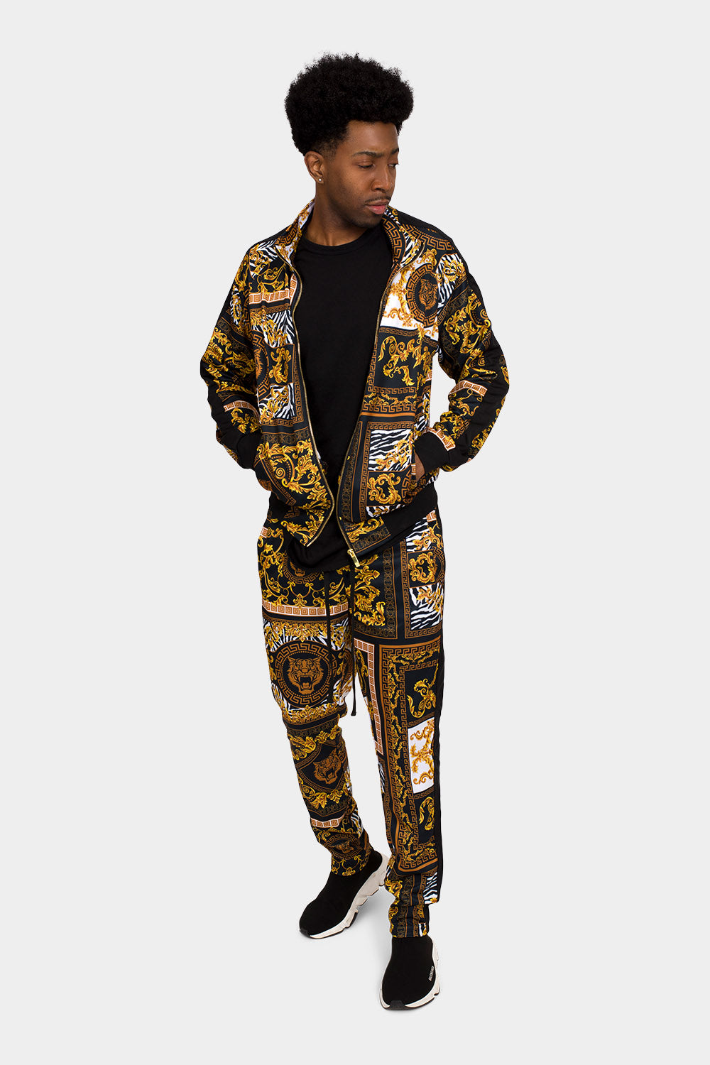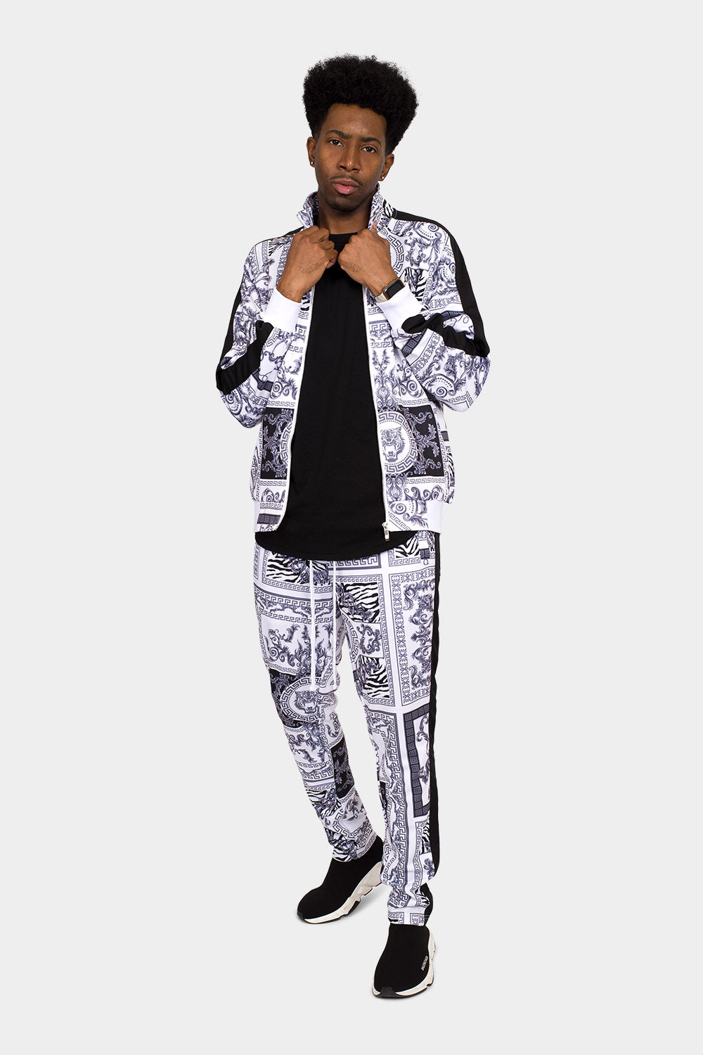 Follow the latest trends inspired by your favorite hip hop artists. Feel comfortable and look fly in our luxury print track suit featuring, black strips going down your legs and arms, an adjustable waistline, and a zipper by the ankle for a custom fit.