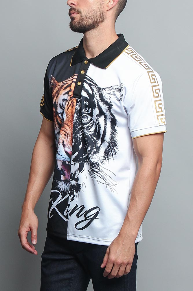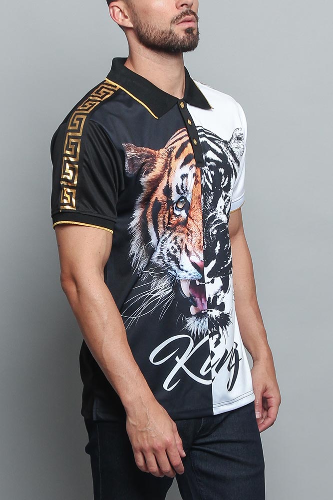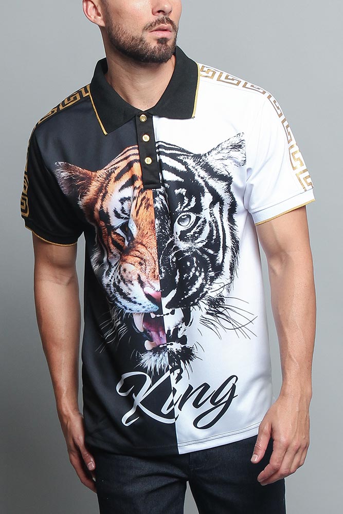 Look fly in our new luxury styled tiger polo. Perfect for looking stylish without the costly prices. Featuring golden metallic foiled bands down the shoulders and golden buttons to compliment the gold and tiger background.