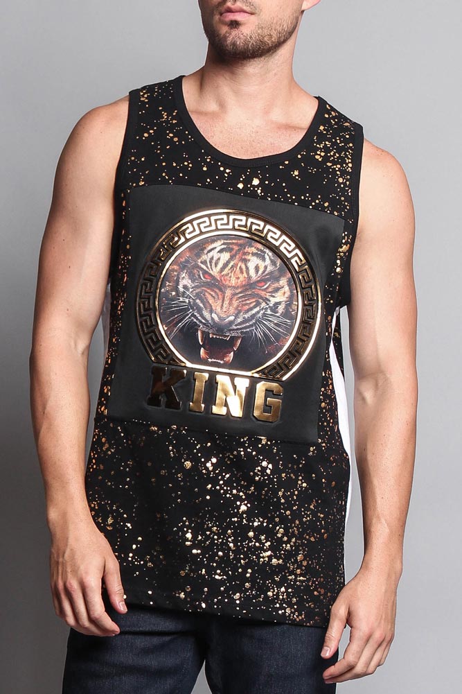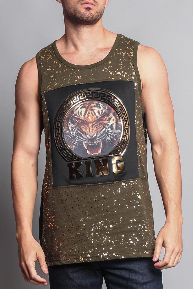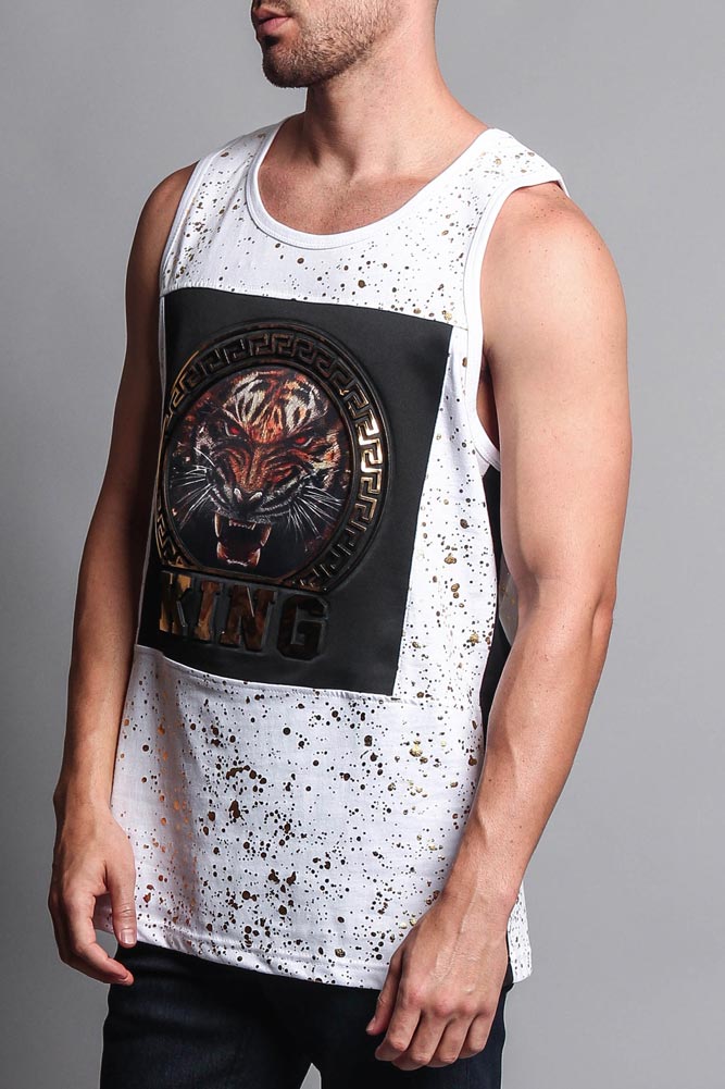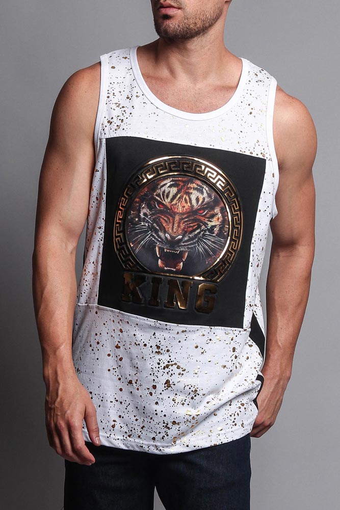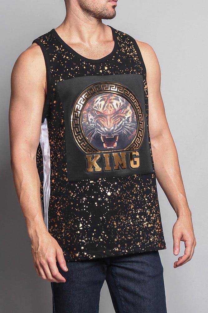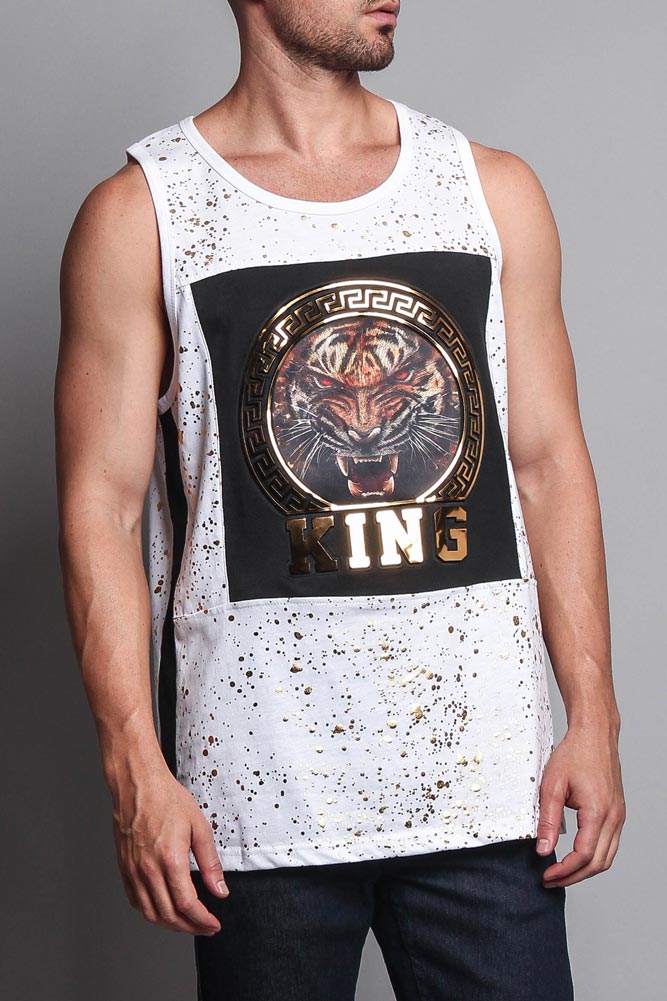 Show everyone you are the true king of the streets like the tiger is the true king of the jungle in our V Tiger King tank top inspired by the latest trends. Featuring a 3D embossed KING logo as well as high fashion inspired prints bordering the tiger head. With a golden foil splatter print background to compliment the tank further.