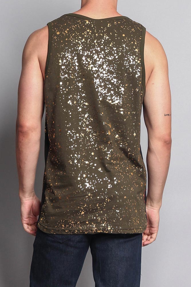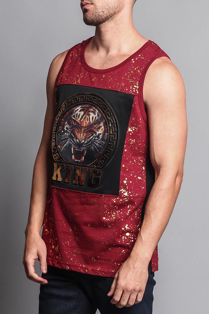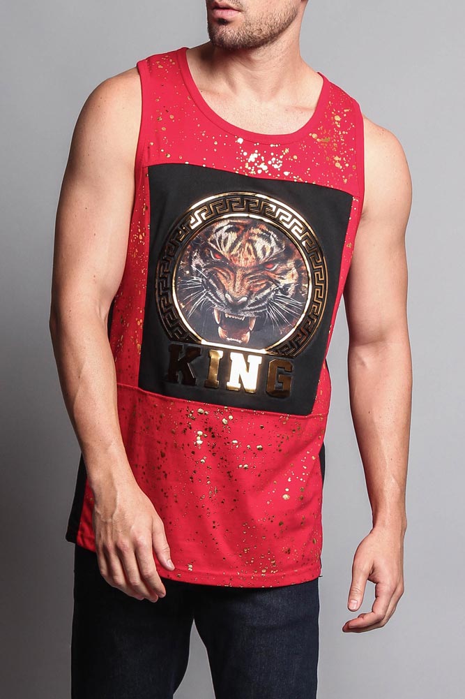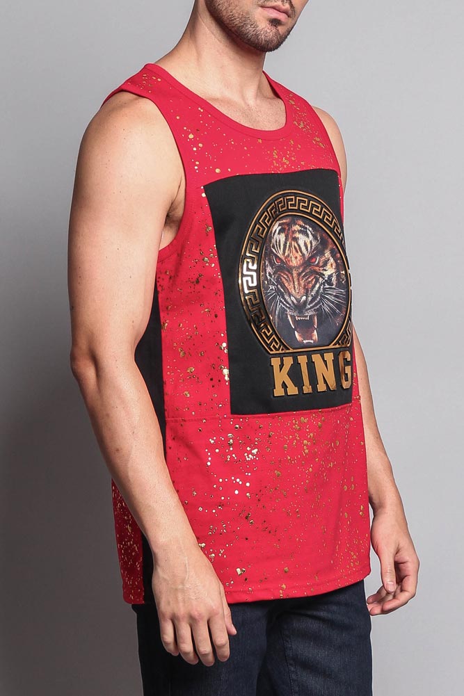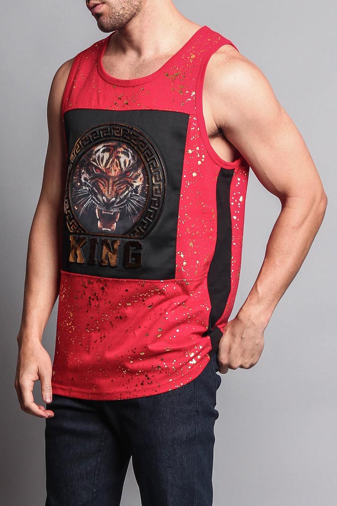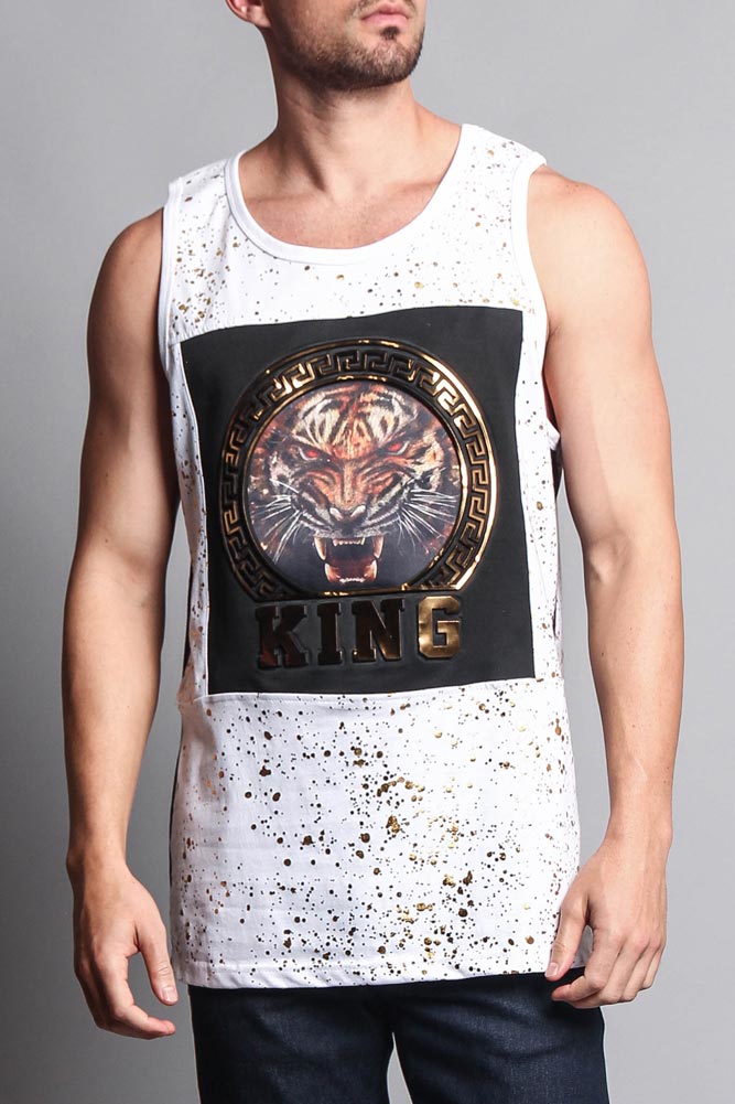 Show everyone you are the true king of the streets like the tiger is the true king of the jungle in our V Tiger King tank top inspired by the latest trends. Featuring a 3D embossed KING logo as well as high fashion inspired prints bordering the tiger head. With a golden foil splatter print background to compliment the tank further.