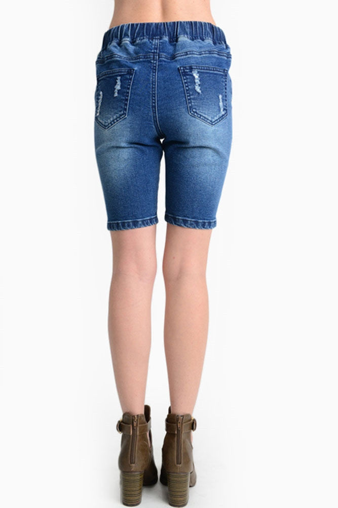 Get ready for warmer weather with these destroyed denim shorts that hit above the knee without being too exposed! Also features an elastic drawstring waist for maximum comfort and fit!