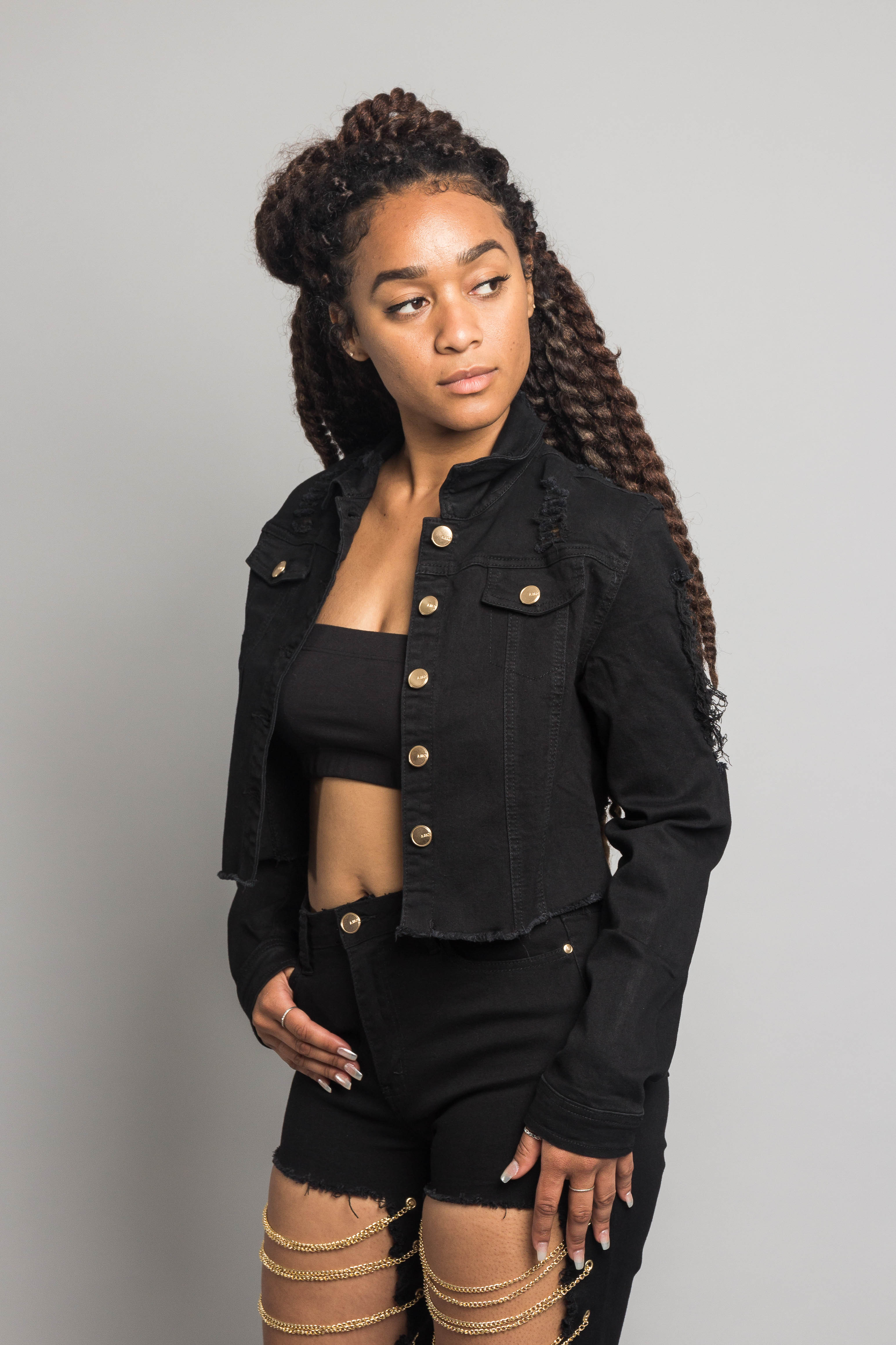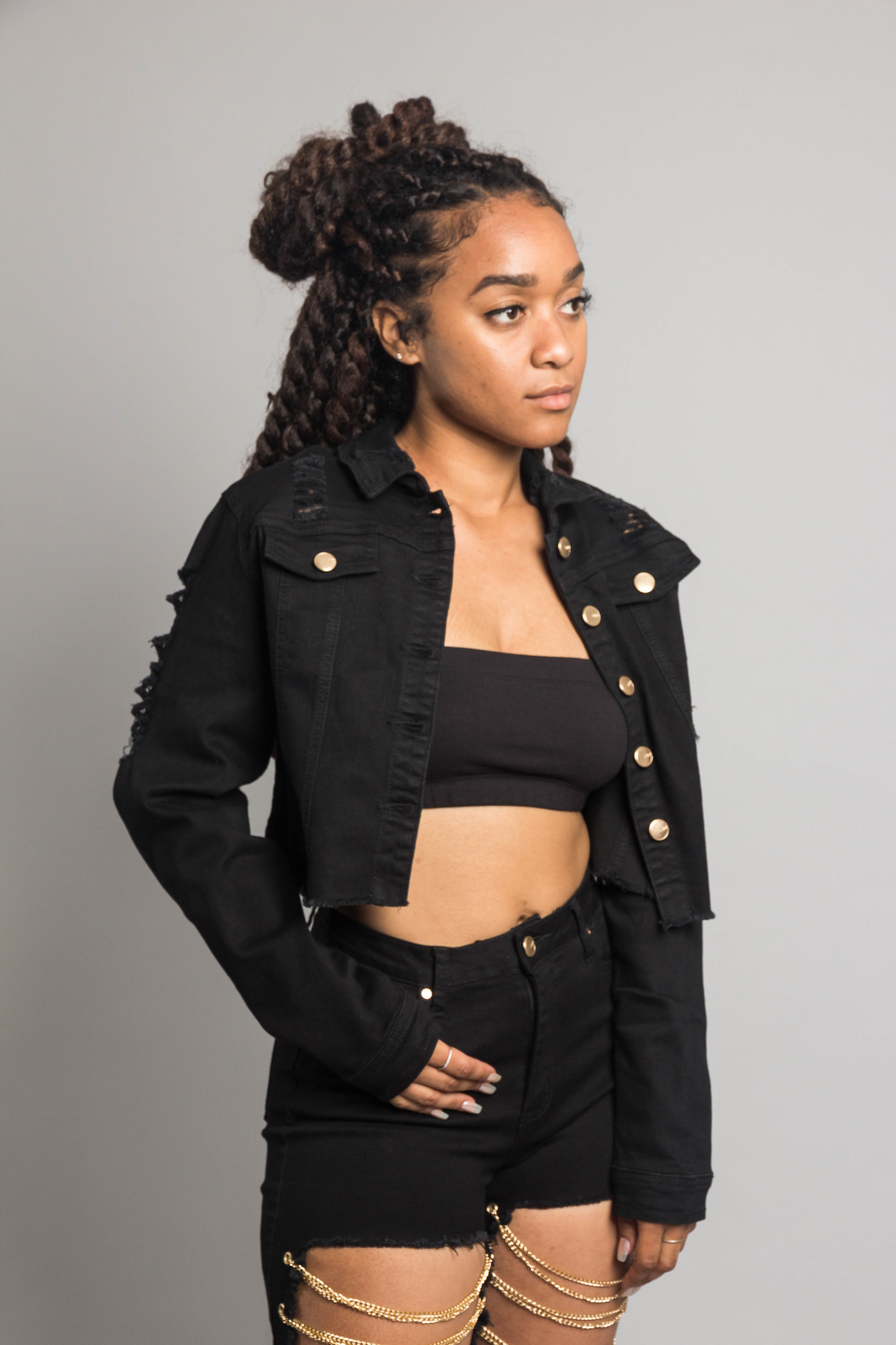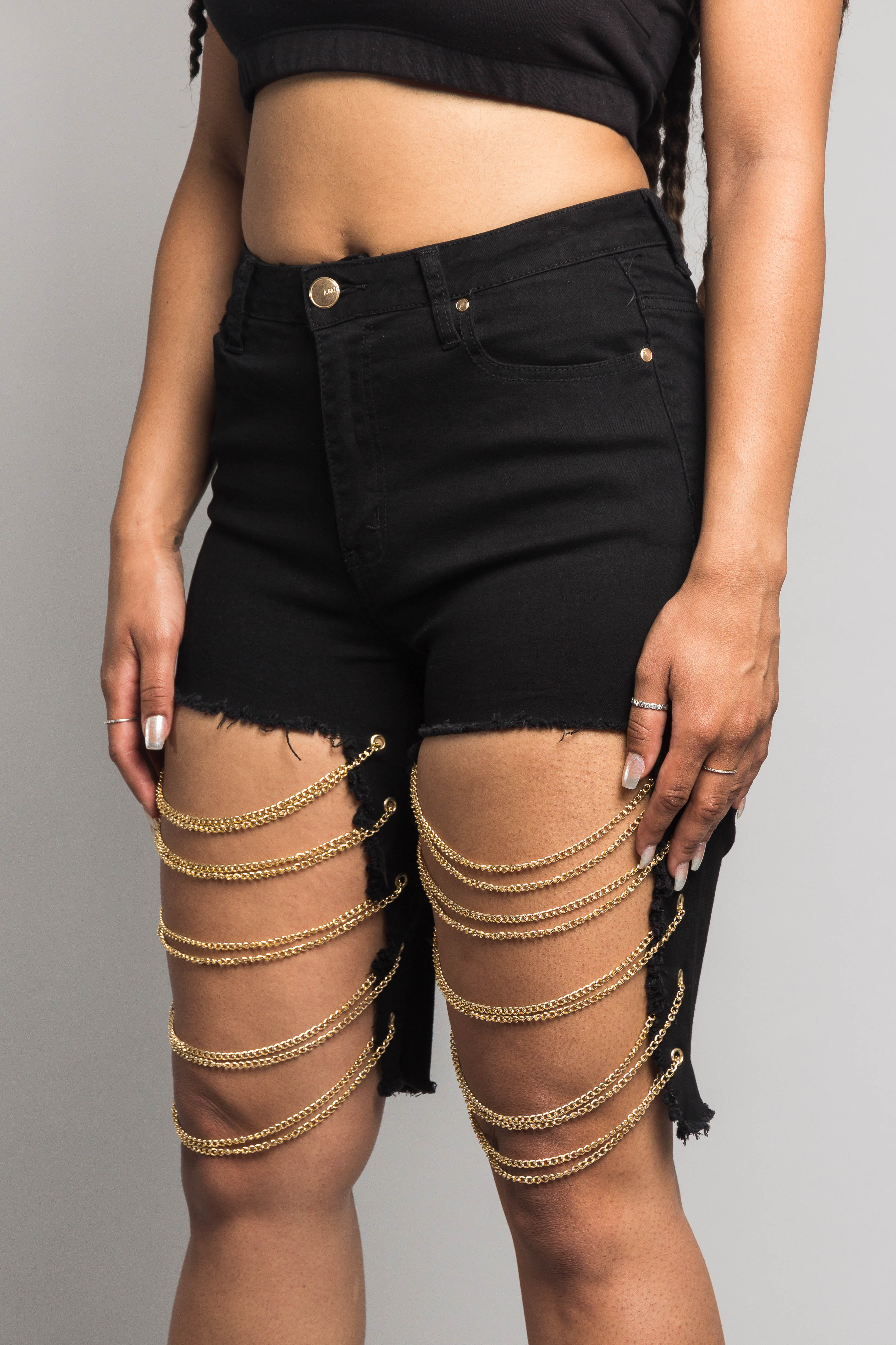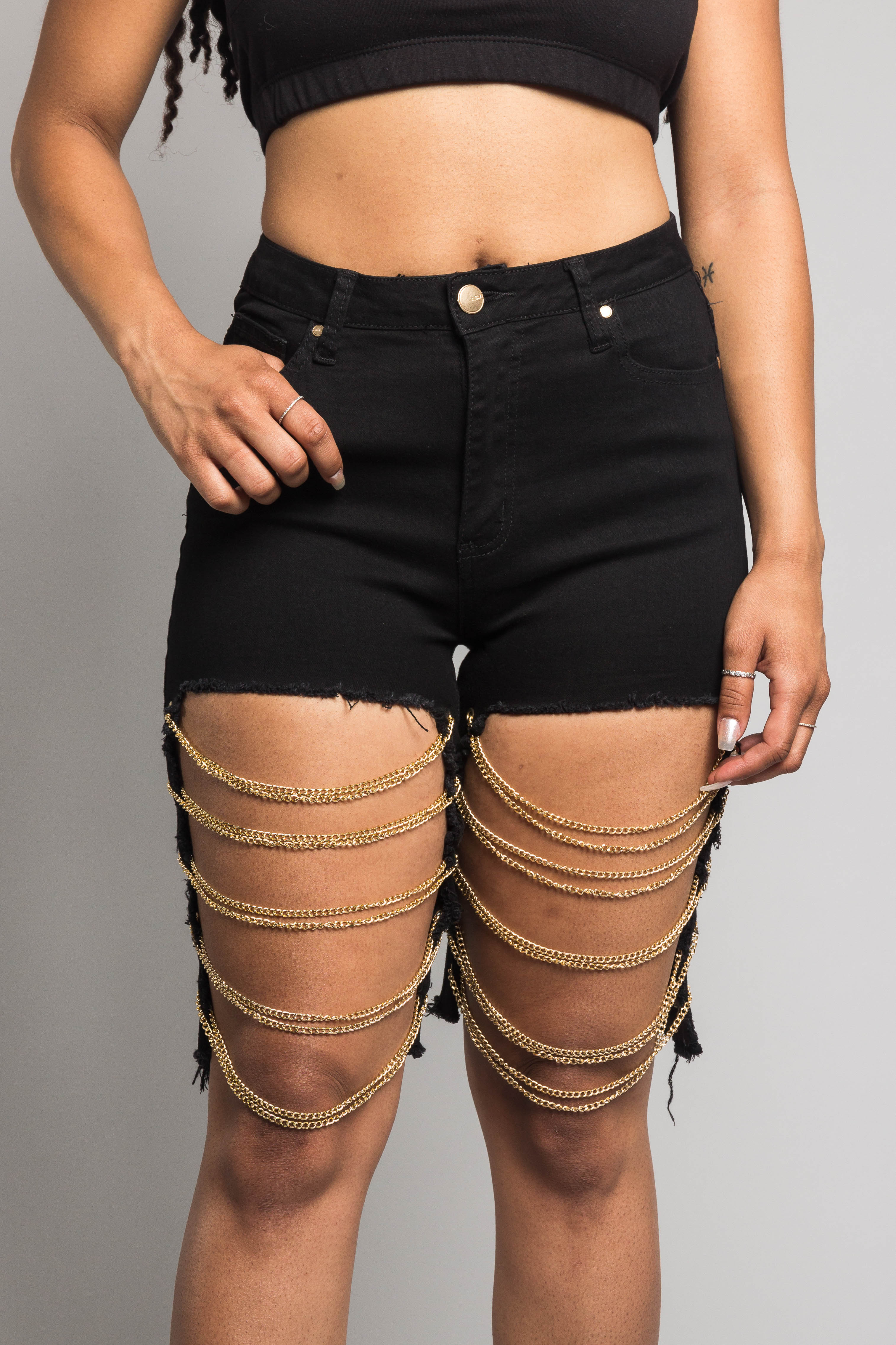 - Matching cutout on legs with gold chains across