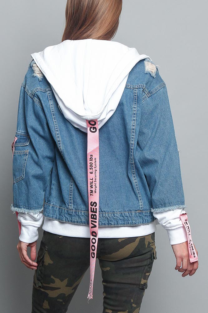 Have more than just a good time in our new double denim jacket! Our new jacket creates an illusion of a layered look to stay cool on warm summer nights. Featuring detailed tags around the jacket for a unique look sure to flatter any fashionista. Made with quality in mind for a comfortable fit.