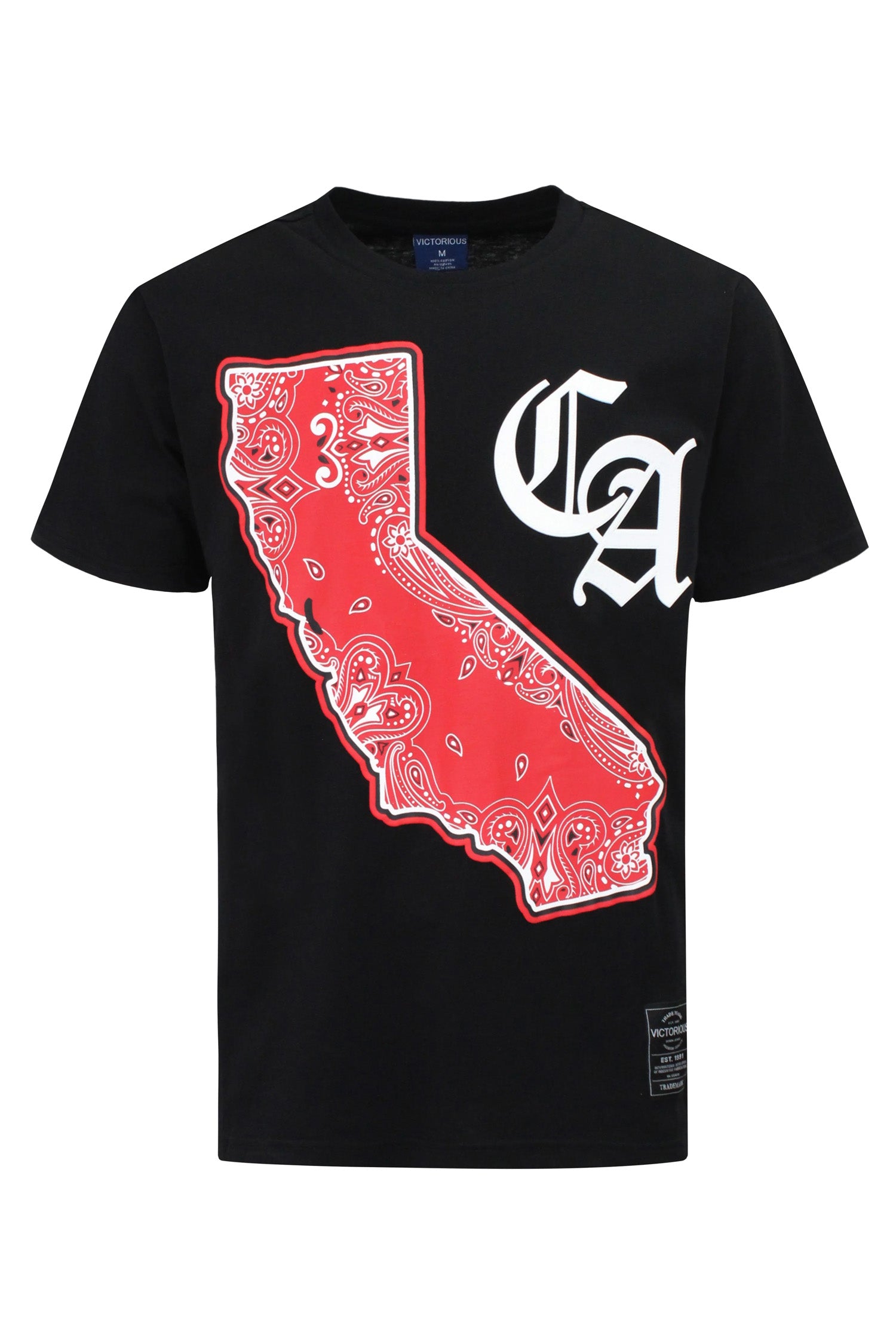 Show off your West Coast pride with this bold California graphic tee. Featuring a large red bandana-print California state outline and bold "CA" lettering, this shirt makes a strong streetwear statement.