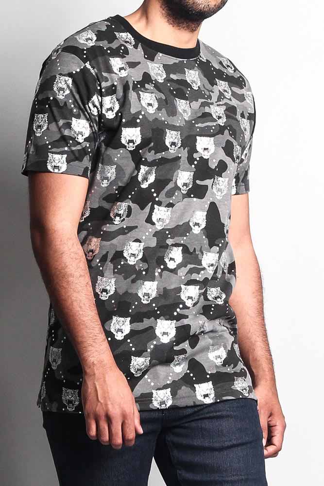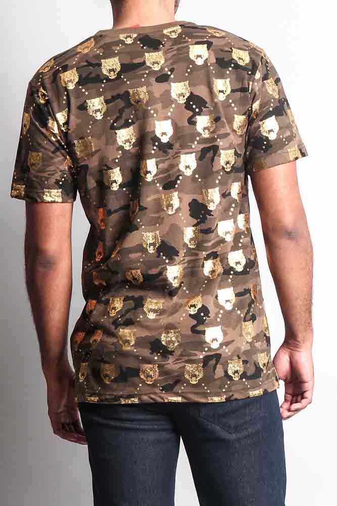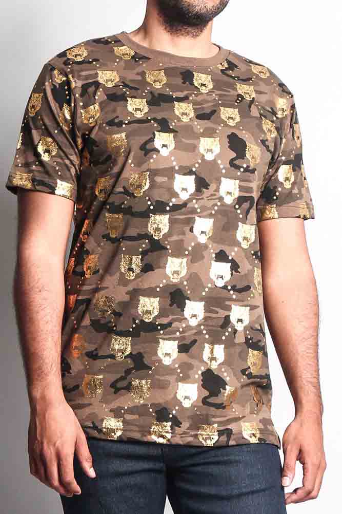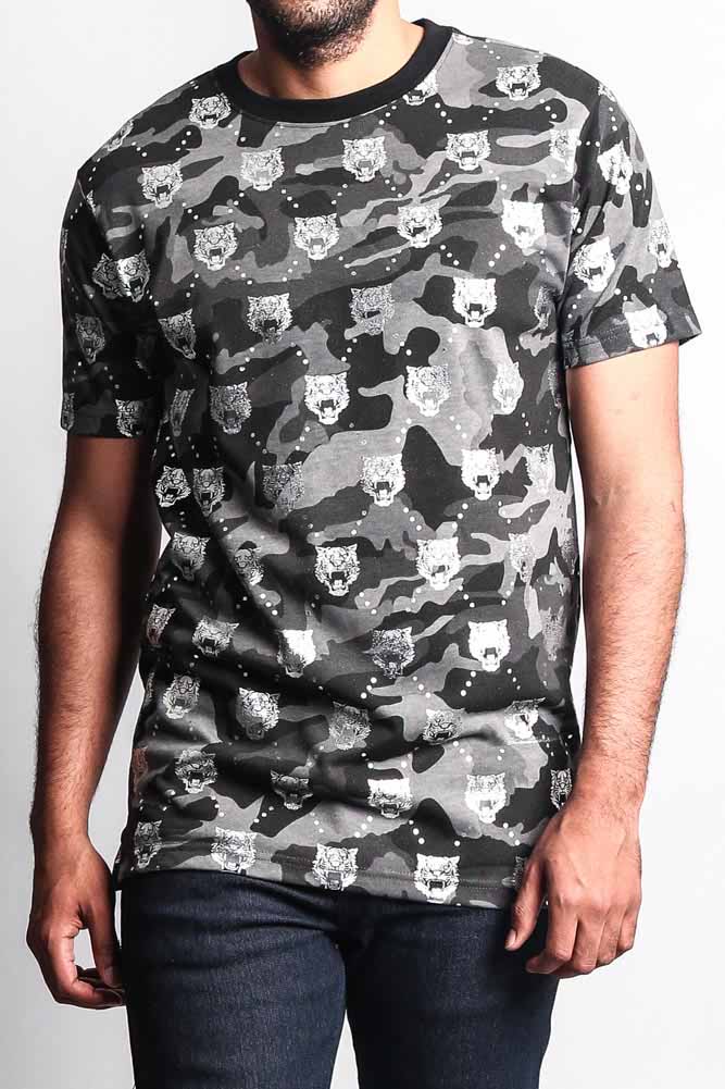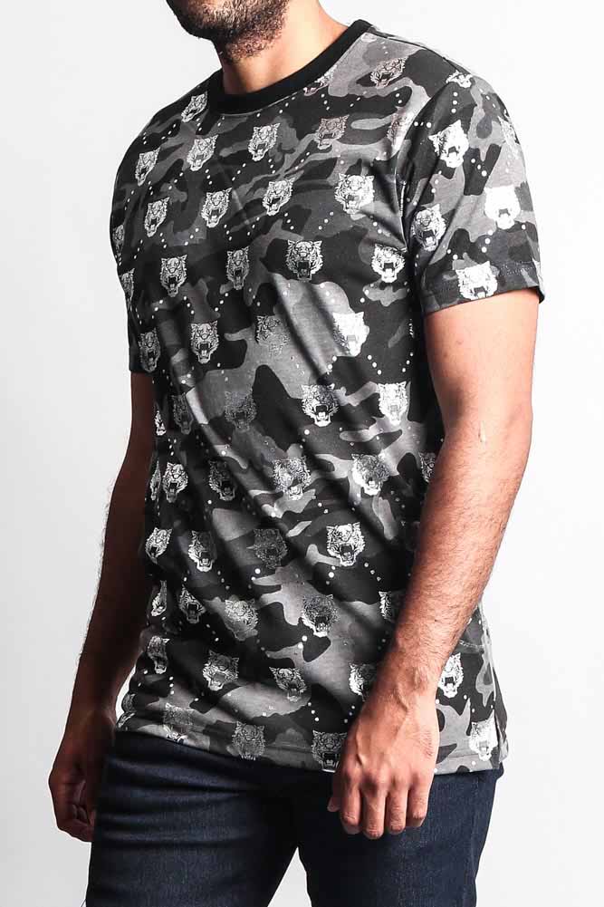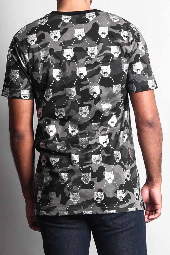Look cool stay cooler in our new camouflage and tiger head T Shirt. Perfect for standing out and looking stylish. Our t-shirt features a metallic foil tiger head print throughout the shirt to stay with the trends.