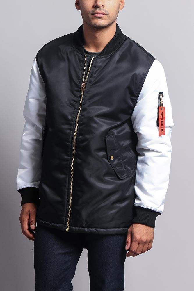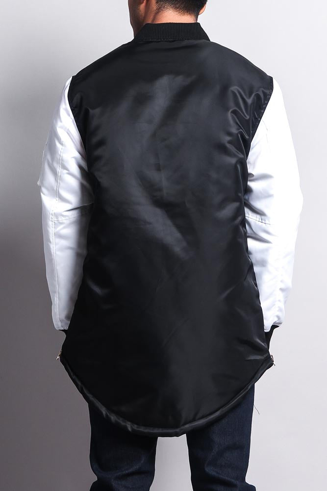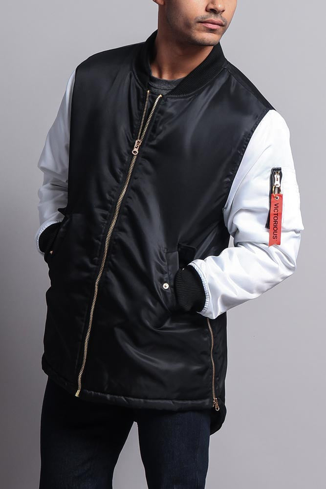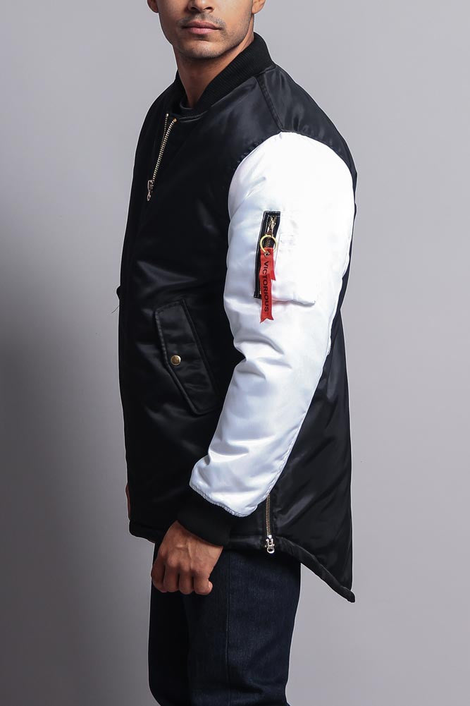 The MA-1 style flight/bomber jacket is a classic style that should be had in every man's closet. Step your game up with this version that features an extended length and contrast sleeves.