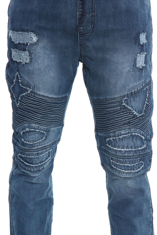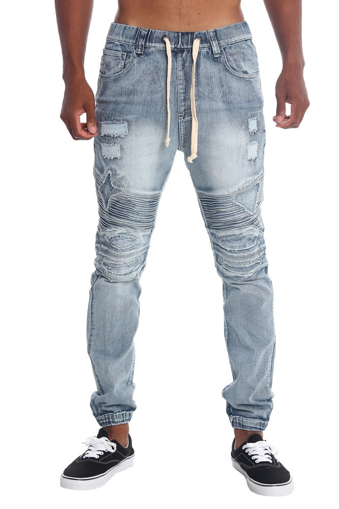 - Drop-crotch, loose through thigh, extreme tapered leg, elastic drawstring waist, elastic cuffs