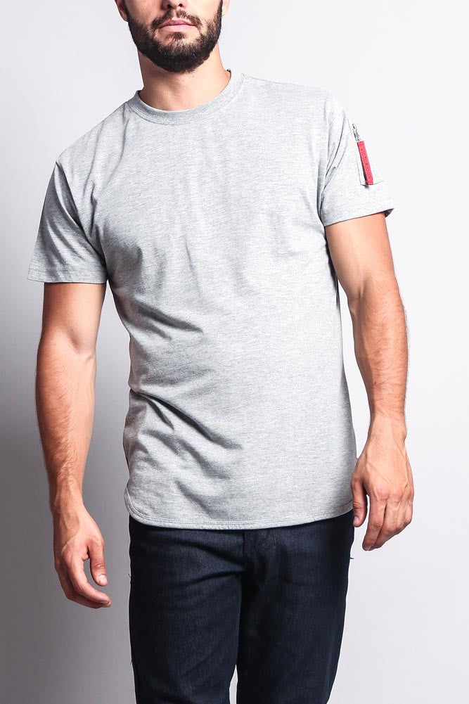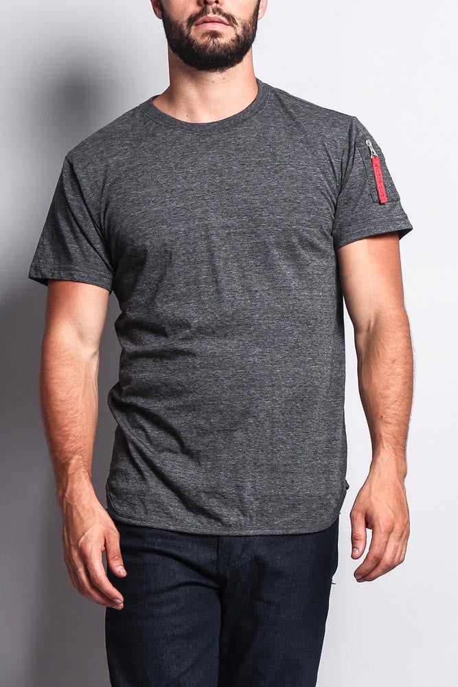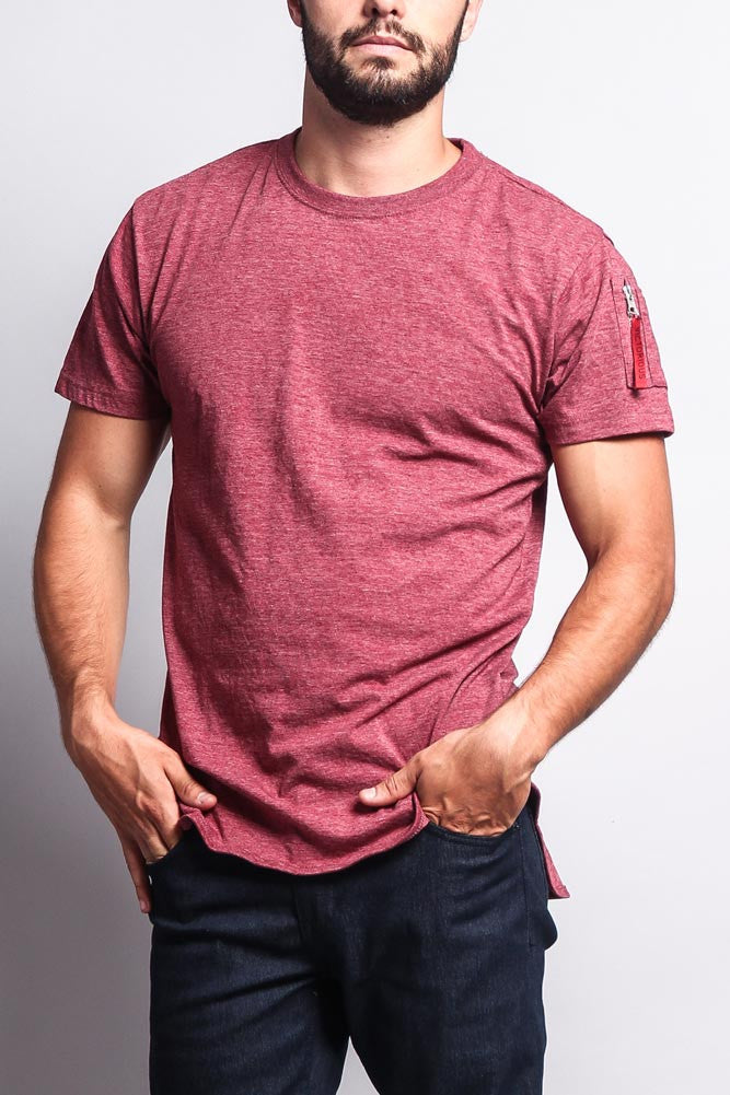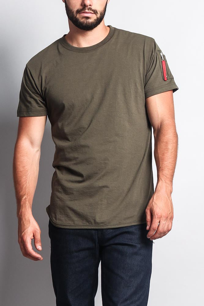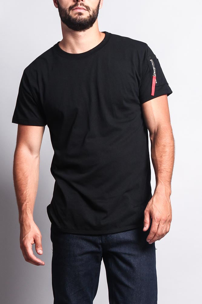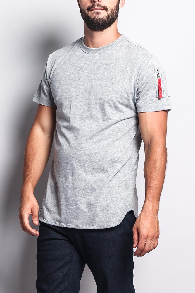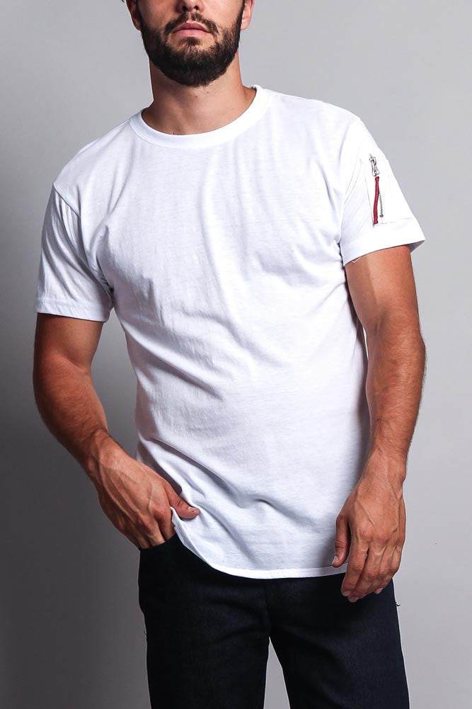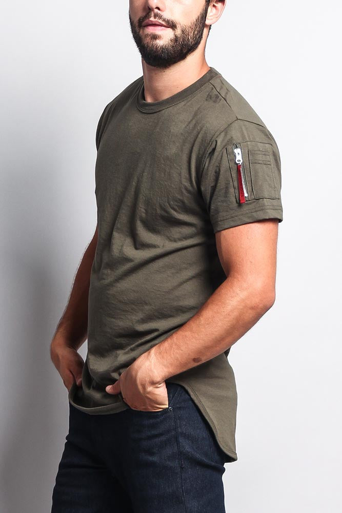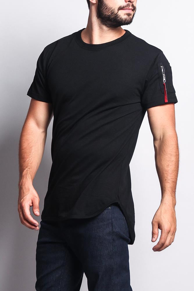 Upgrade your basic tee with this trendy extended length t-shirt with a curved baseball-style hem. Features that classic timeless MA-1 style sleeve pocket that you might originally find on this season's most popular bomber jackets. Looks great layered under a short jacket!