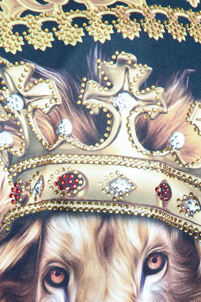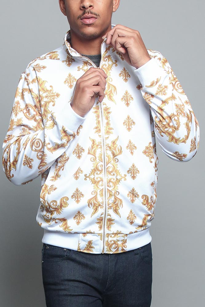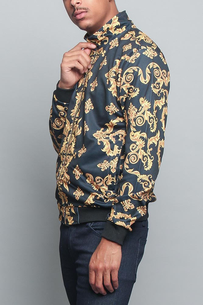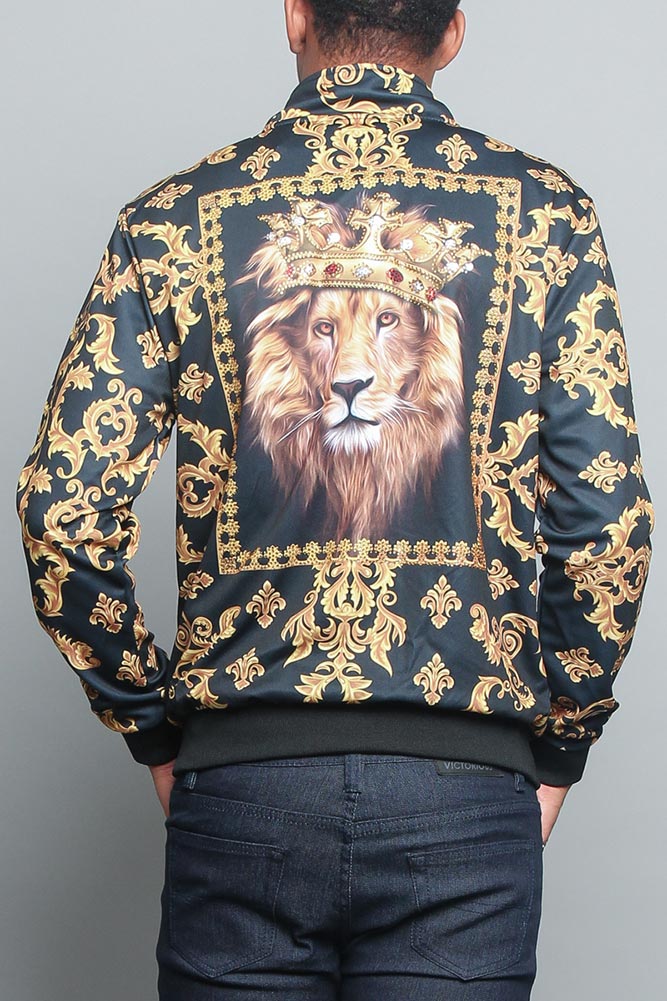 Throw on this luxury styled zip up jacket and stay warm while looking great. This stylish jacket features a luxurious print and a bedazzled Lion King on the back. This jacket features gold detailing as the background to further compliment this jacket. Perfect for layering or dressing up any look!