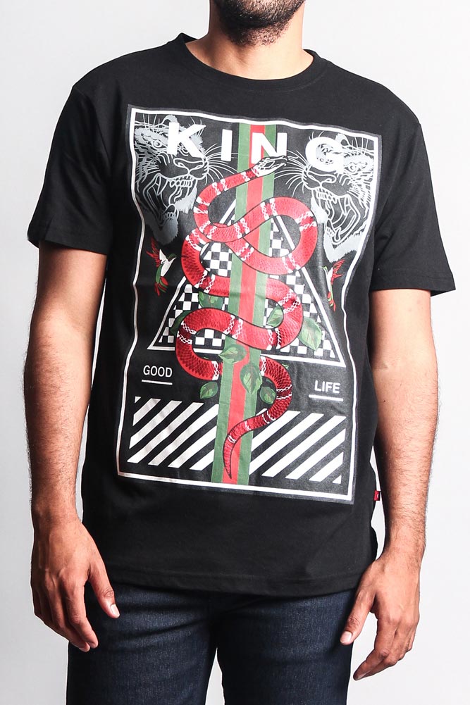 Stick with the trends in our high fashion inspired t shirt. Features green/red stripes, checkerboard, a bold snake design and so much more.