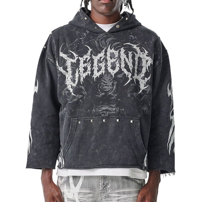 Step into bold style with this Legend hoodie featuring a heavy metal-inspired graphic on a vintage washed black base. Designed with raw edges, stud accents, and a relaxed fit for that worn-in street look. Soft, mid-weight fabric keeps it comfortable while still making a statement.