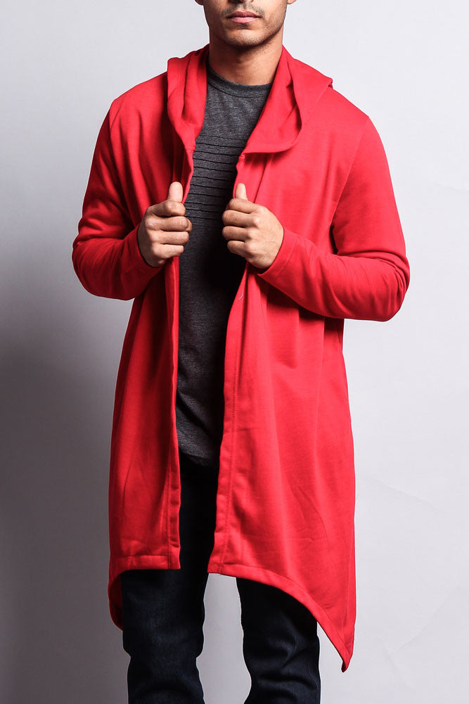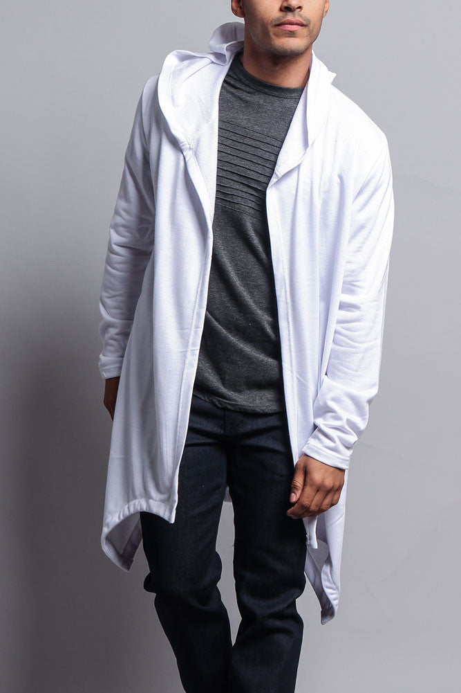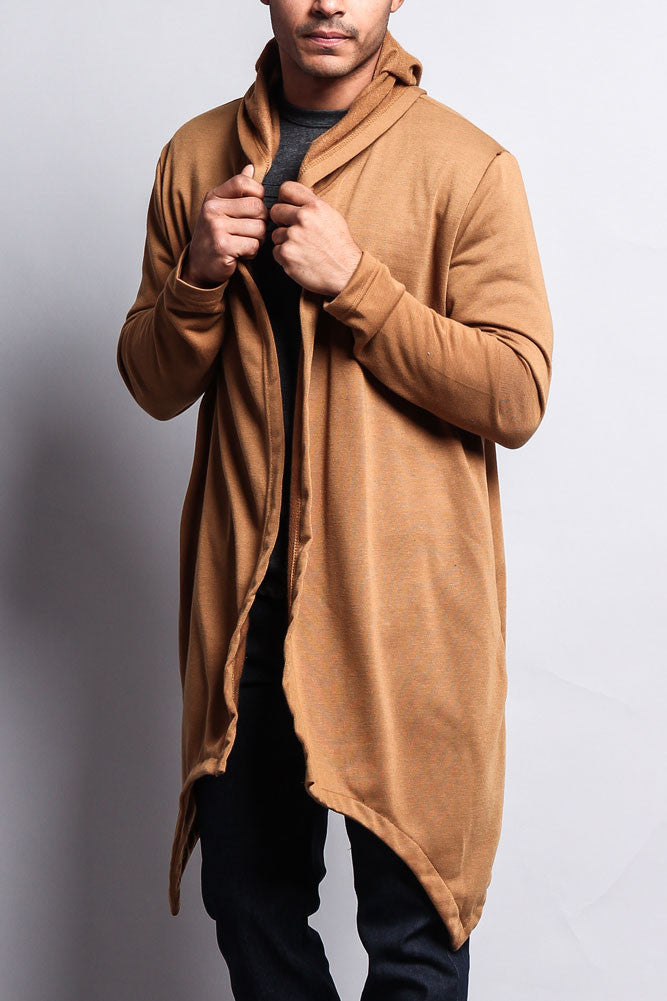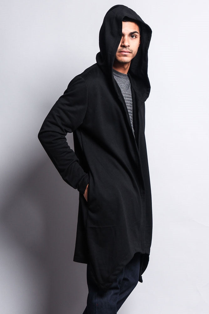 Layer up with all new styles like this great trendy open hoodie that features an elongated length as well as a unique drape and cape style look.