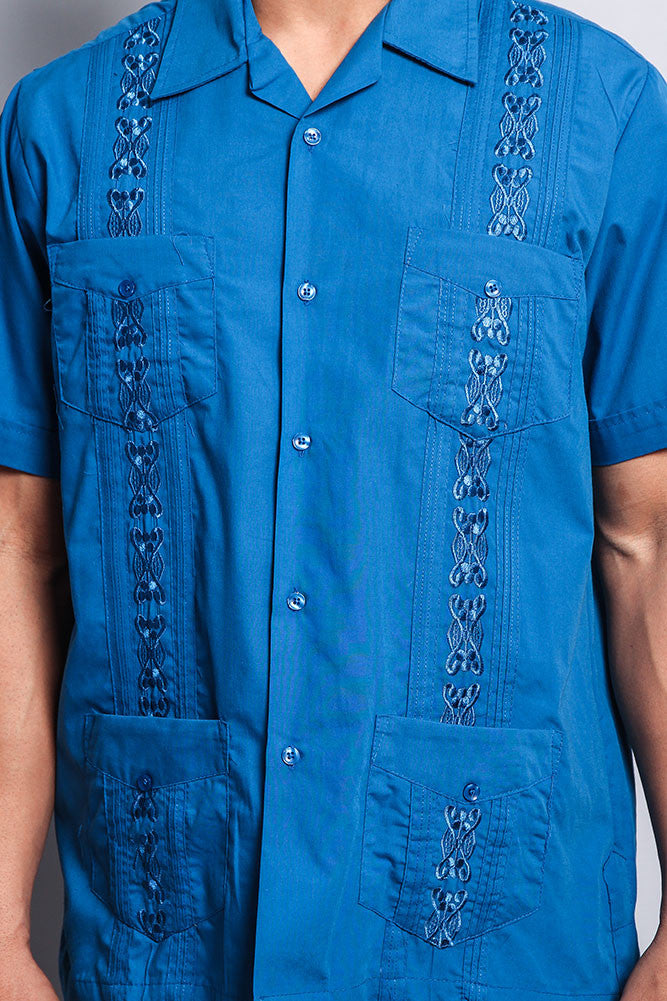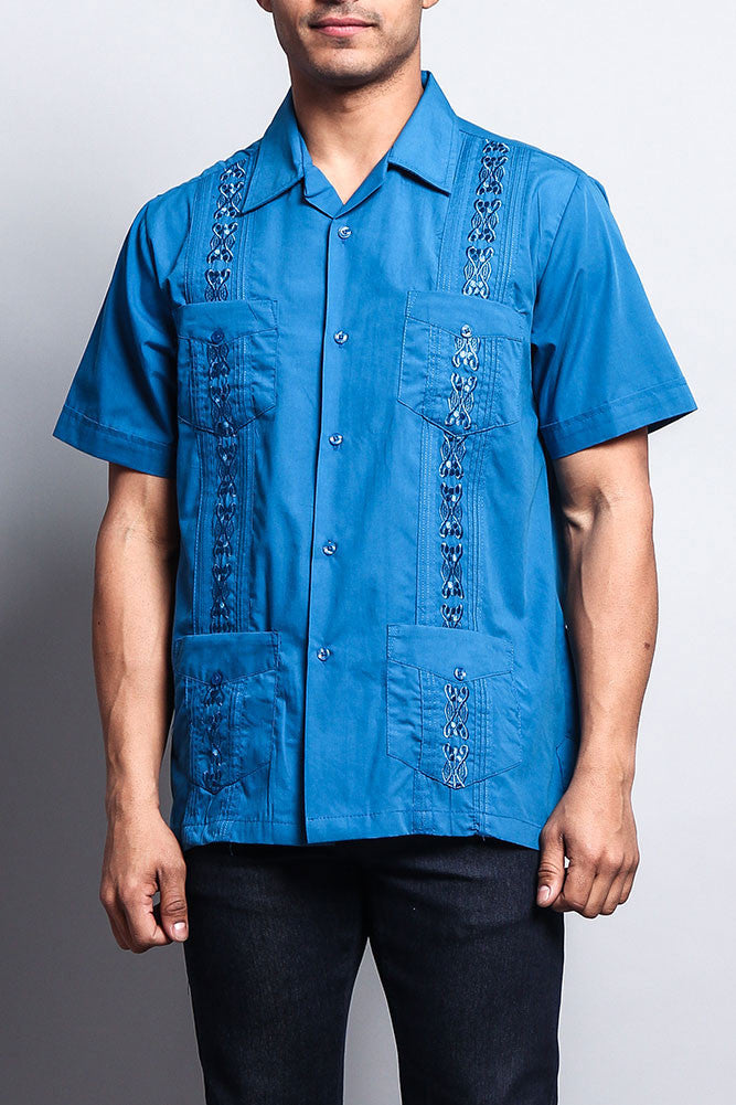 Upgrade your warm-weather wardrobe with this Cuban style guayabera shirt detailed with embroidery going down both sides.