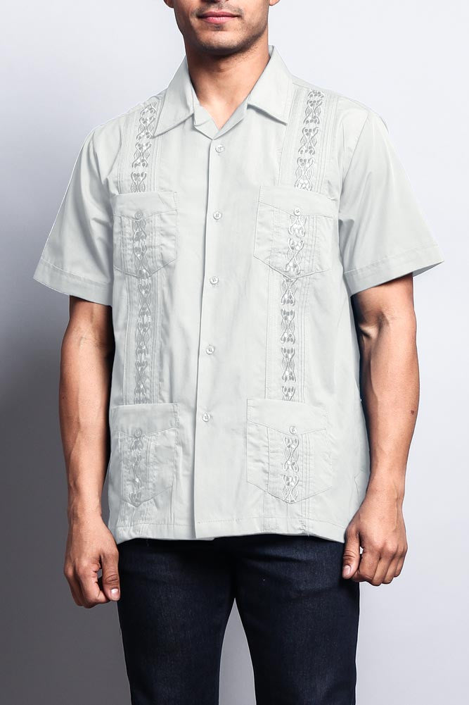 Upgrade your warm-weather wardrobe with this Cuban style guayabera shirt detailed with embroidery going down both sides.