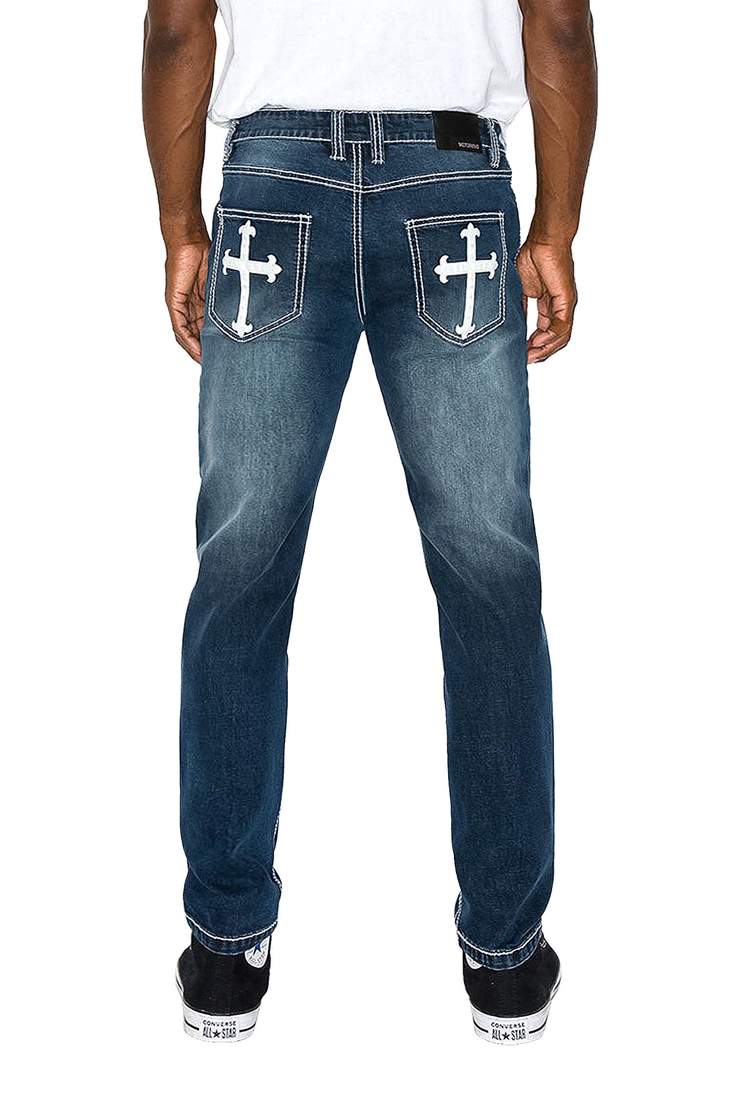 Slim fit denim jeans, with thick stitches and cross embroidery patched on the back pocket