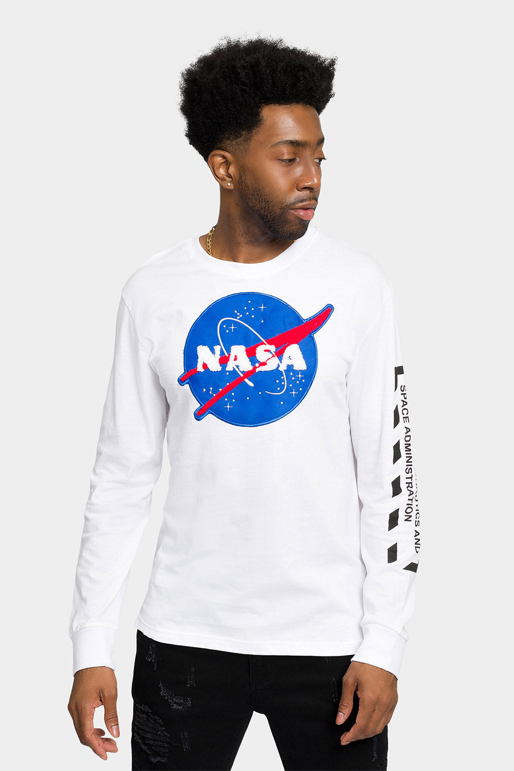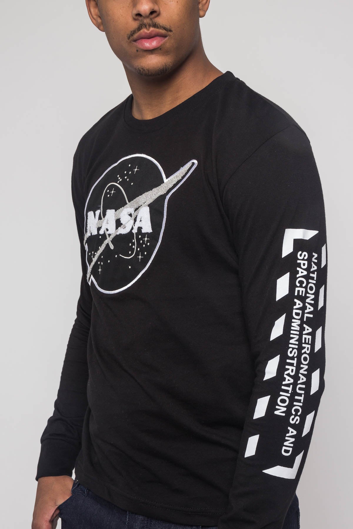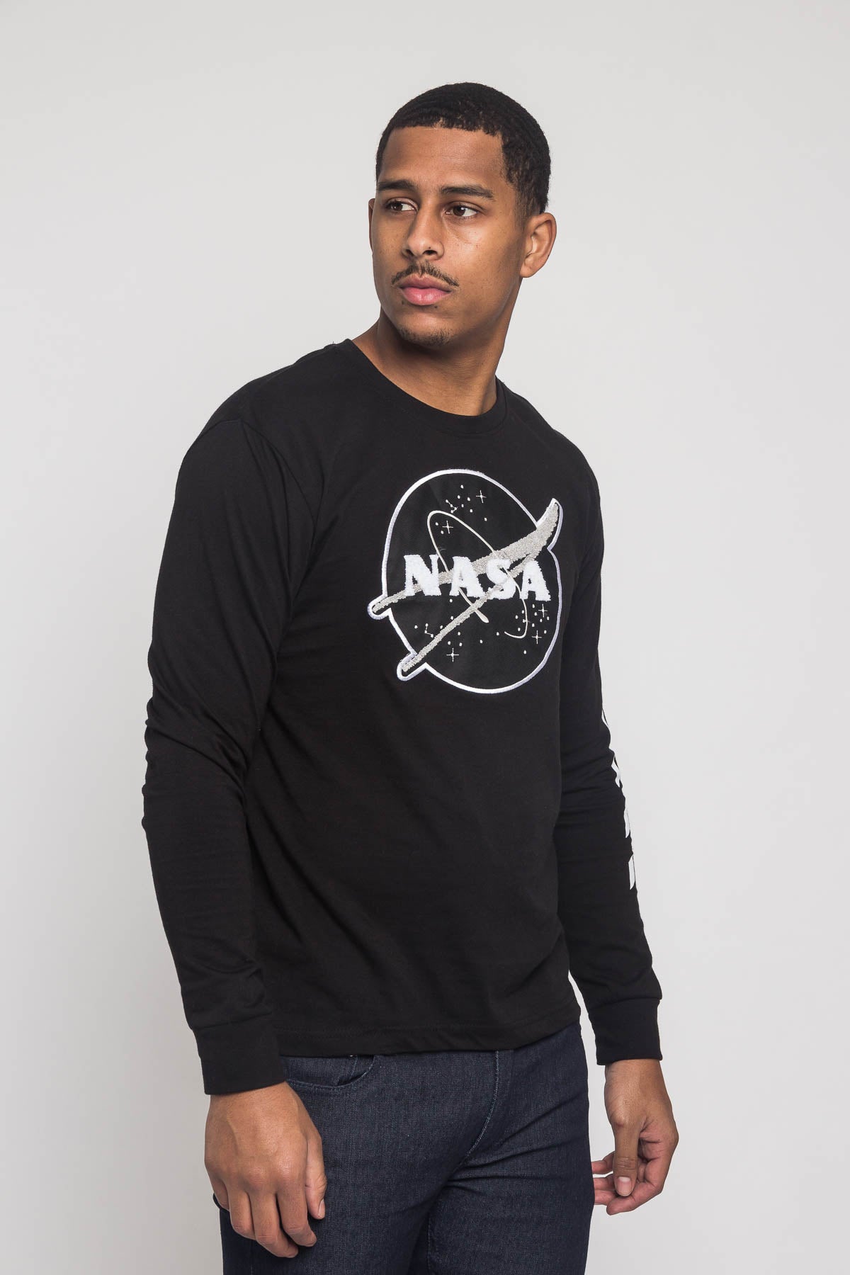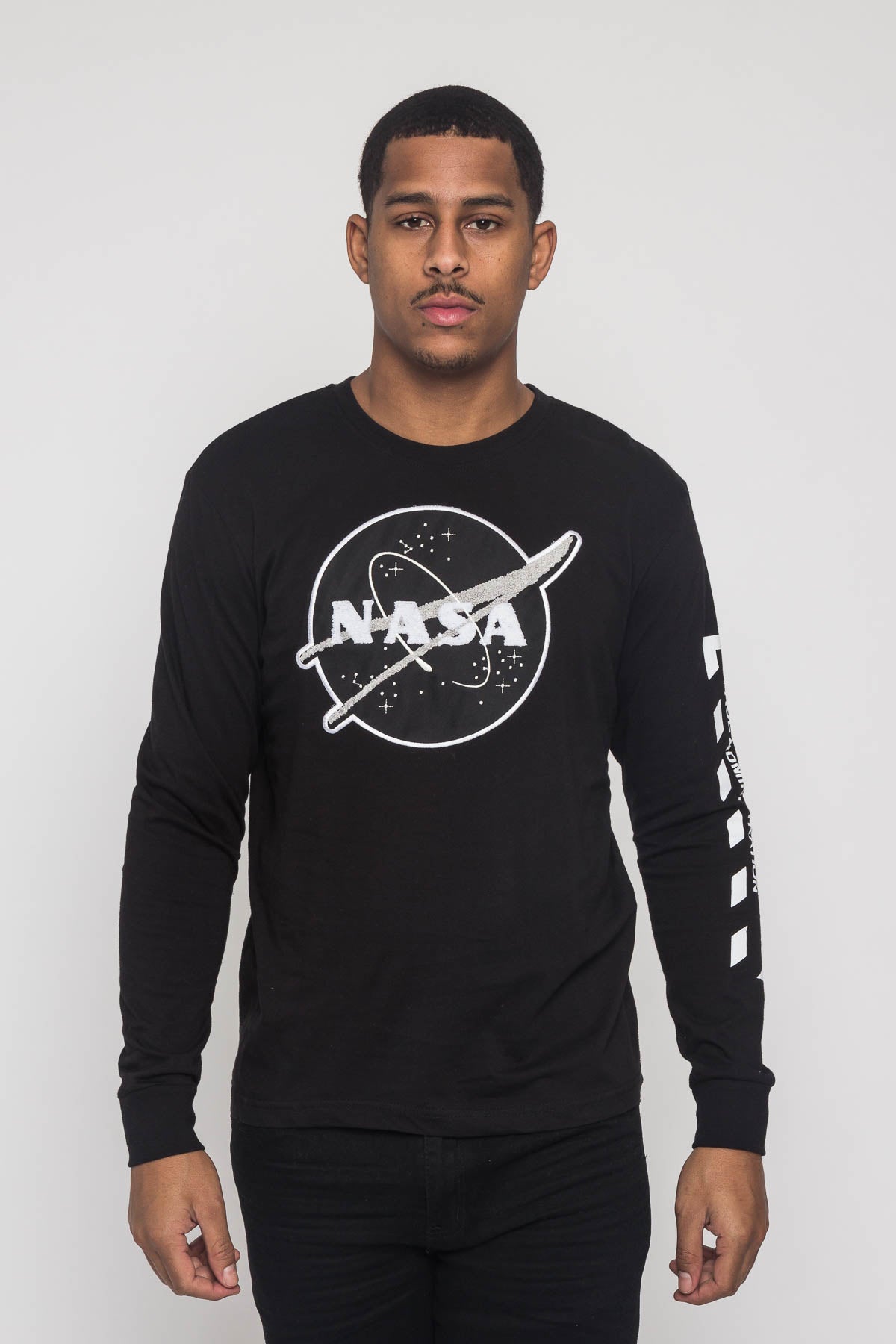 Pop out and stand out wherever you go in our trendy new shirt. Our super stylish long sleeve is the perfect shirt to throw on to rock any look. This tee features a popular NASA chenille patch, perfect to catch anyone's attention while complimenting the latest trends.