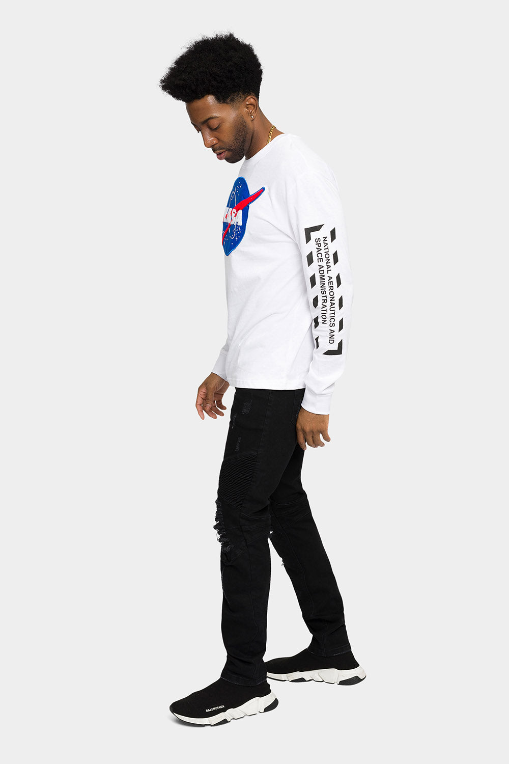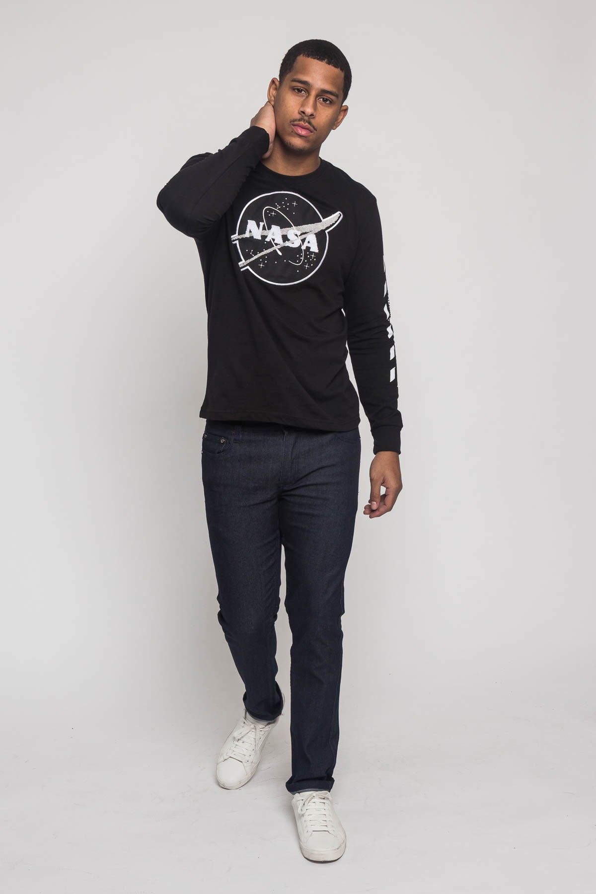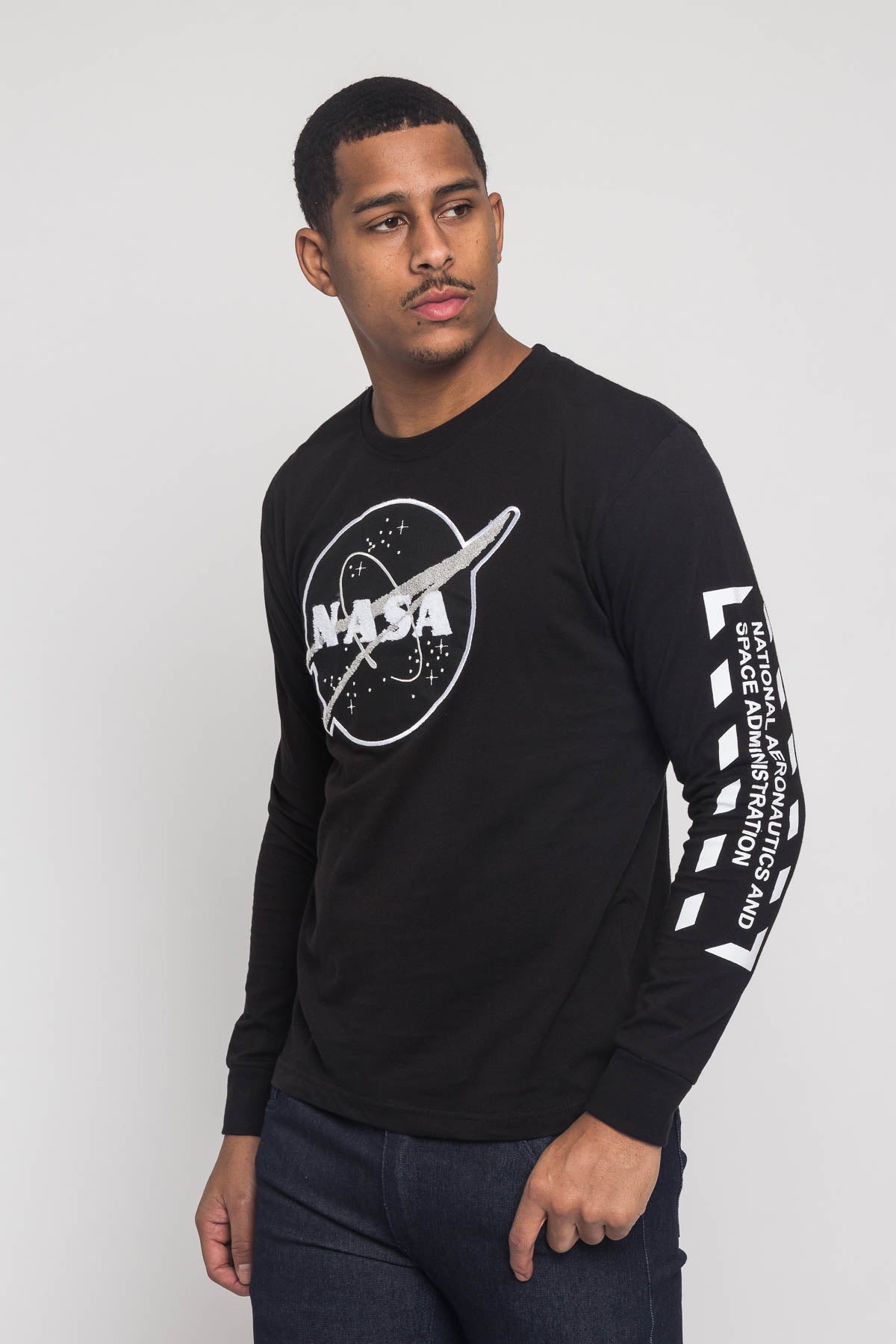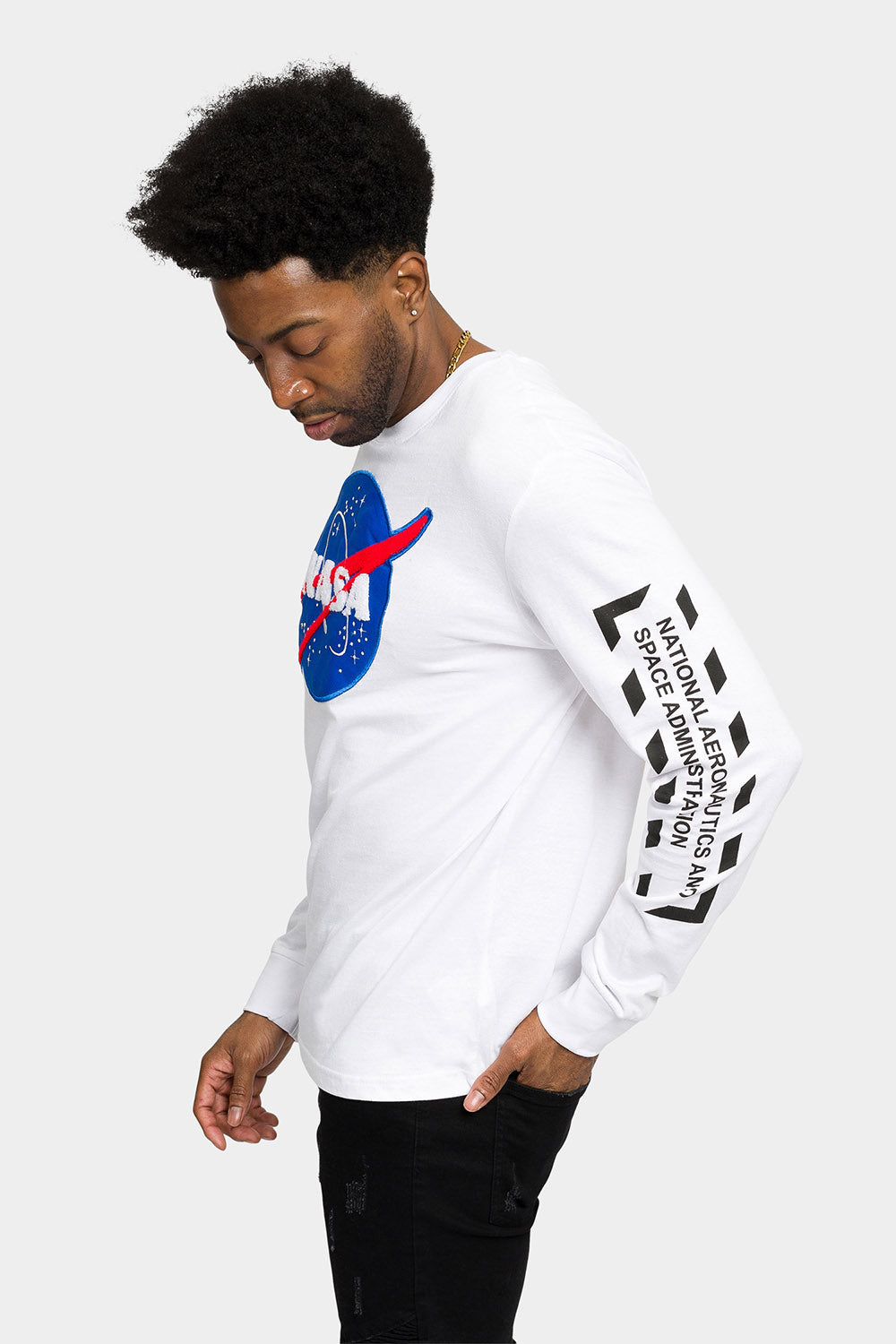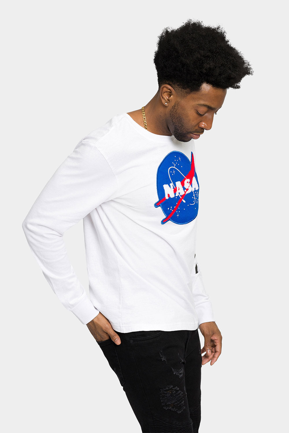 Pop out and stand out wherever you go in our trendy new shirt. Our super stylish long sleeve is the perfect shirt to throw on to rock any look. This tee features a popular NASA chenille patch, perfect to catch anyone's attention while complimenting the latest trends.