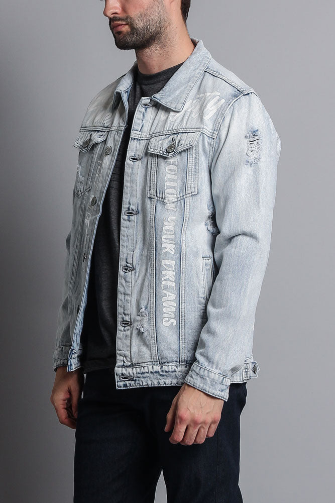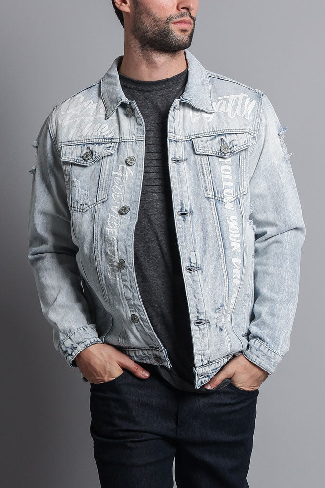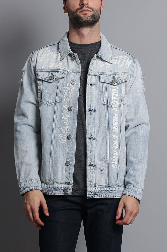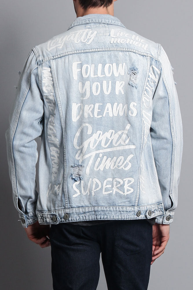 This jacket is made from bleach blue denim featuring scribbled writing and distressed detailing.