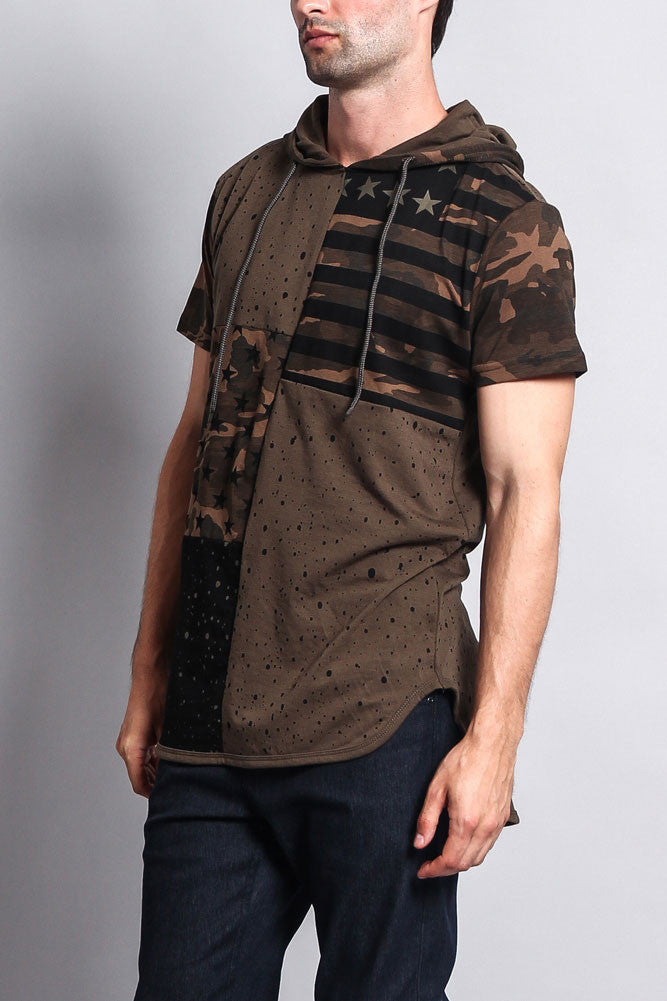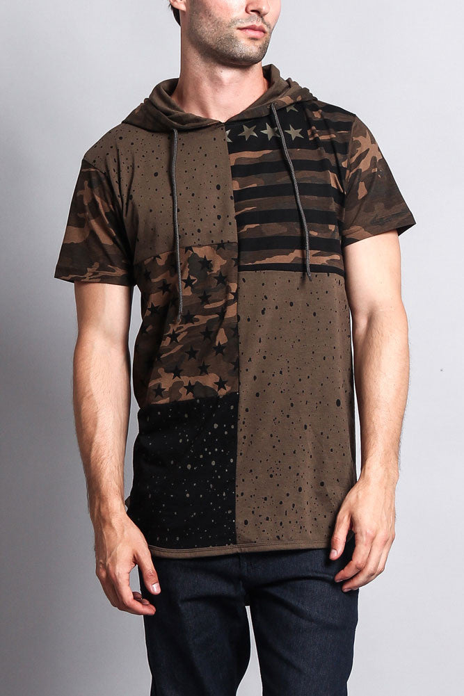 Star Print Block Camo Splatter Hooded T-Shirt