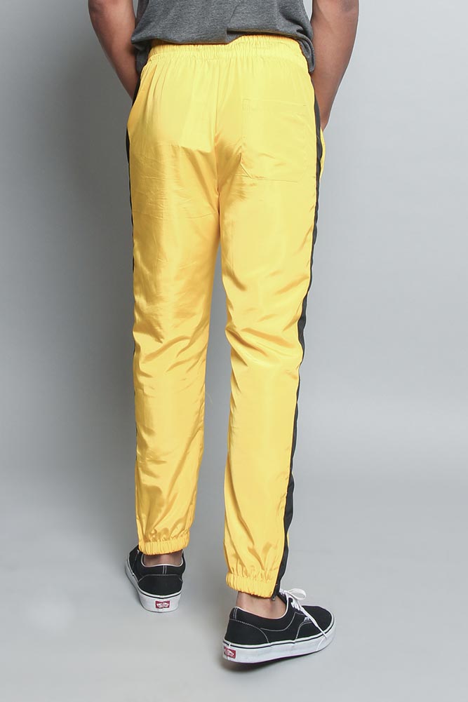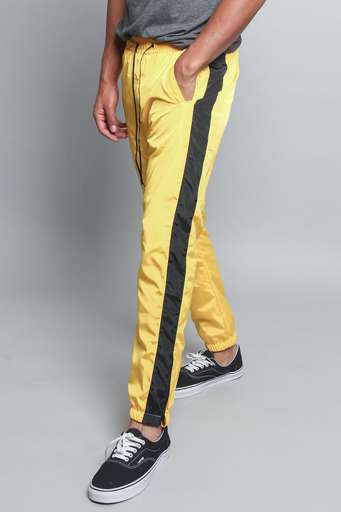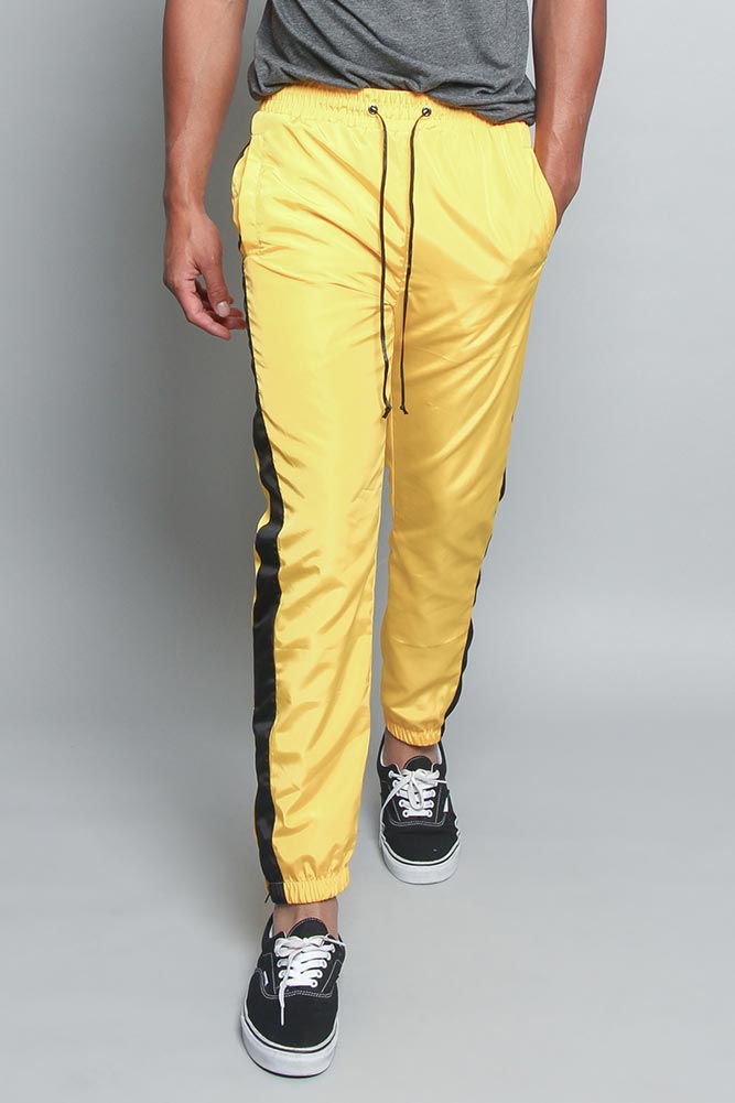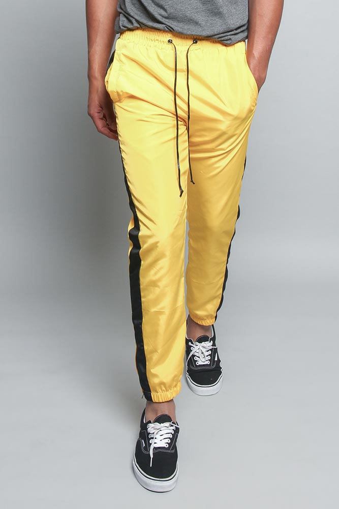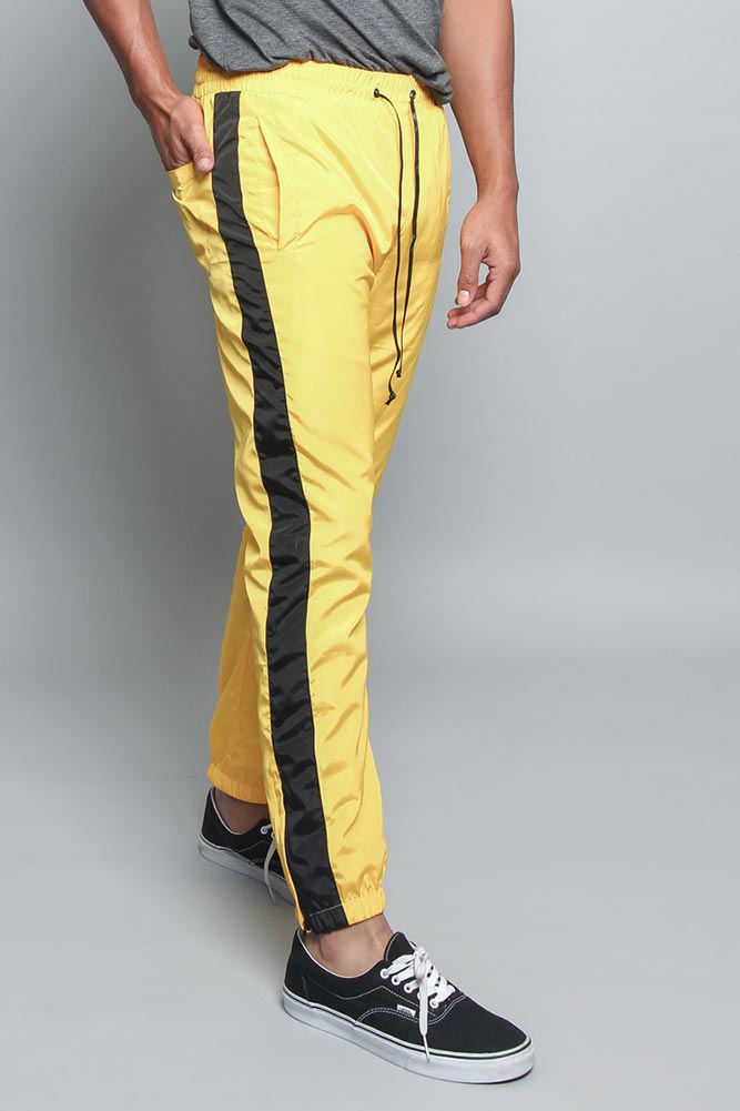 Try our new pair of wind breaking pants featuring a contrast colored trim on the side of your legs, an elasticized drawstring waistband, front slant pockets, and cuffed fit on the ankle.