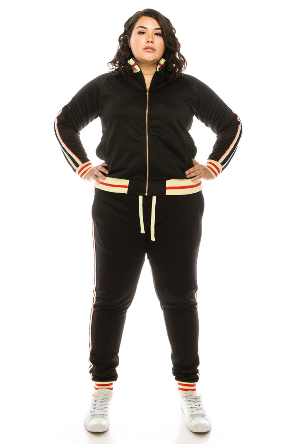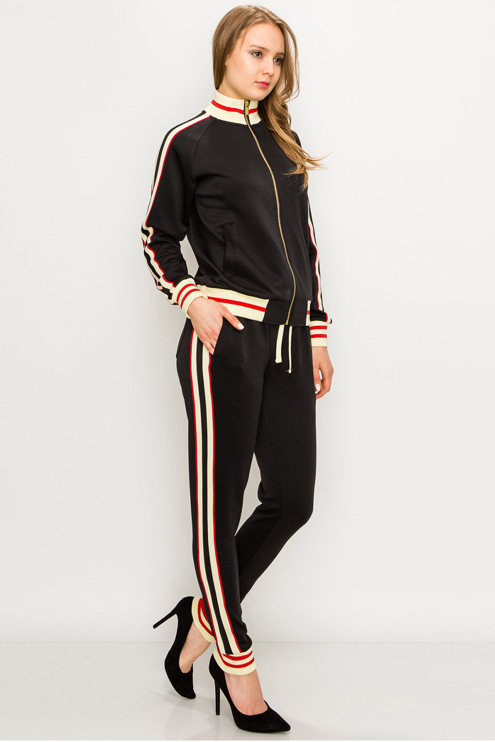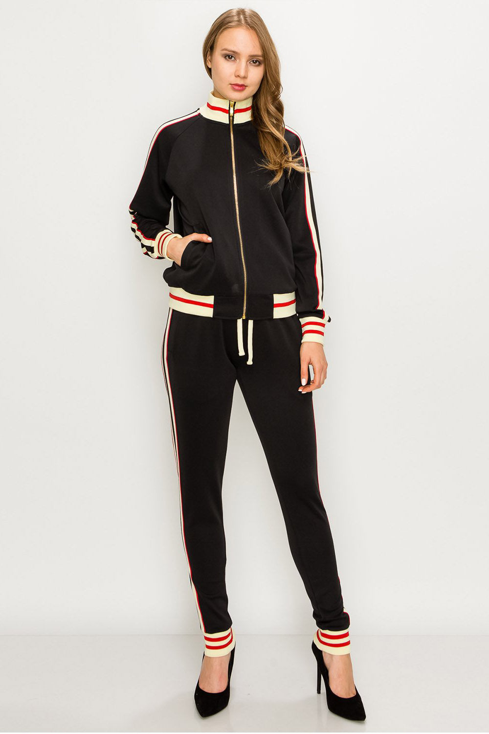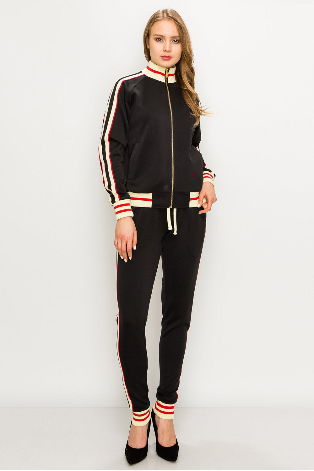 An essential track suit in everyone's closet, this super trendy tracksuit is inspired by high fashion trends without the name brand prices. This track suit features a solid colored base with retro-inspired trimmed detailing along the sides, collar, and cuffs. The perfect outfit to throw on and conquer your day while looking effortlessly fashionable. Dress it up with some heels or go for a casual slay with some sneakers. Pair with our cropped cami (RT32671) to complete this look.
