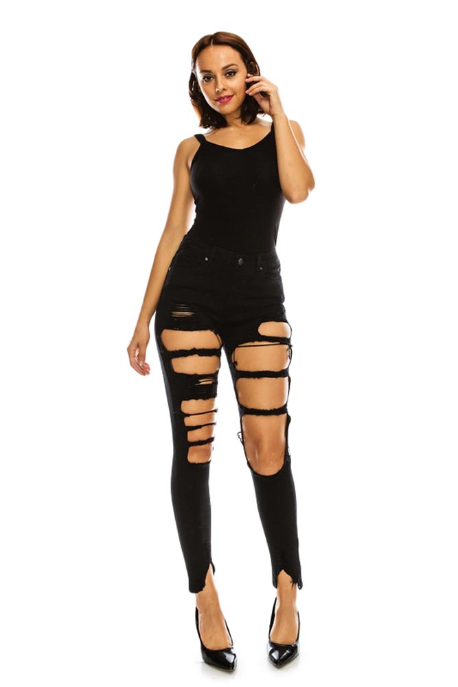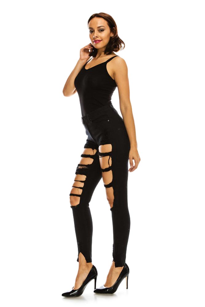 Stay effortlessly stylish and comfortable with the popular and versatile skinny jeans, now in trendy high-waisted, pre-ripped style. Detailed with a torn front hem and classic 5 pocket styling.