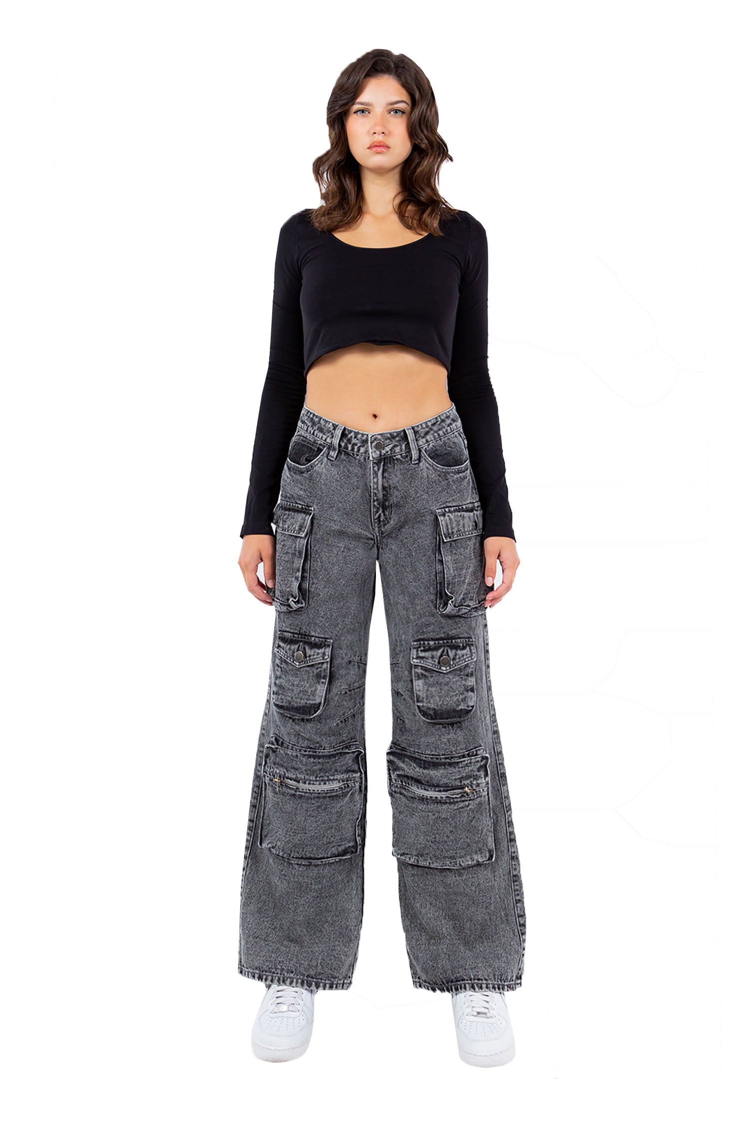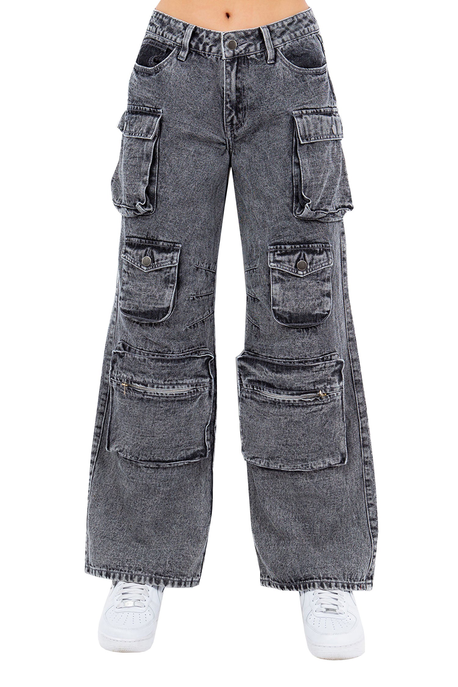 Women's High Rise Stone Washed Cargo Pocket Loose Fit Denim Jeans