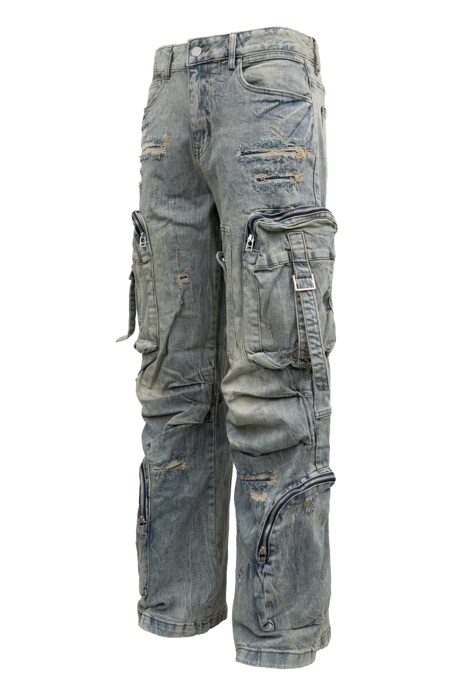 Bring back early 2000s street style with these Y2K-inspired wide fit denim cargo pants. Featuring a baggy silhouette, washed and distressed details, and oversized utility pockets with zipper accents, they deliver the perfect blend of style and function.